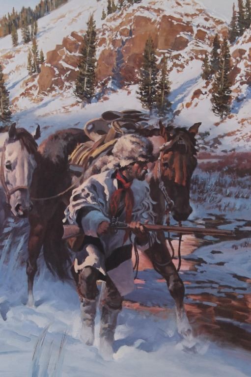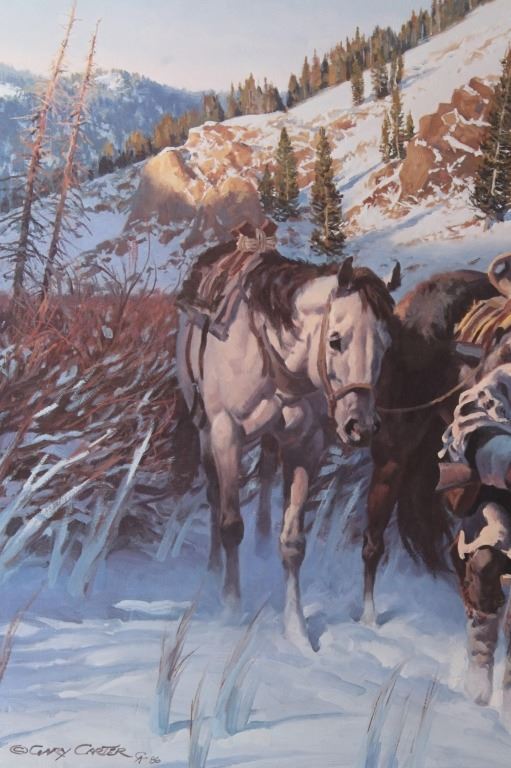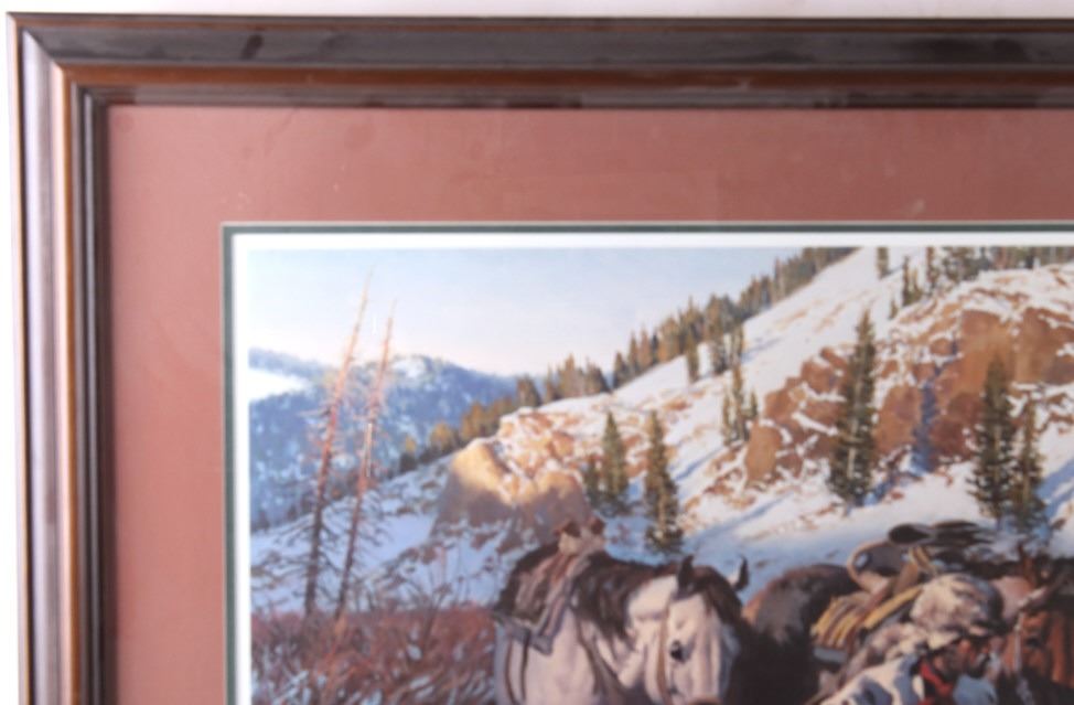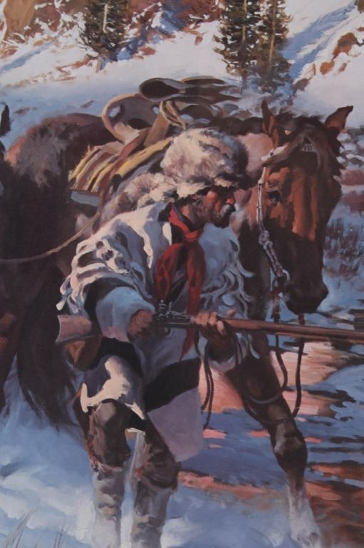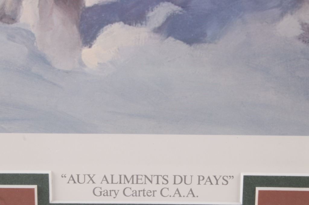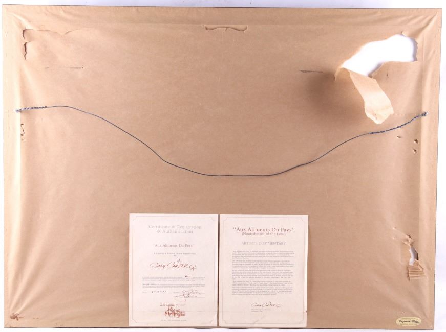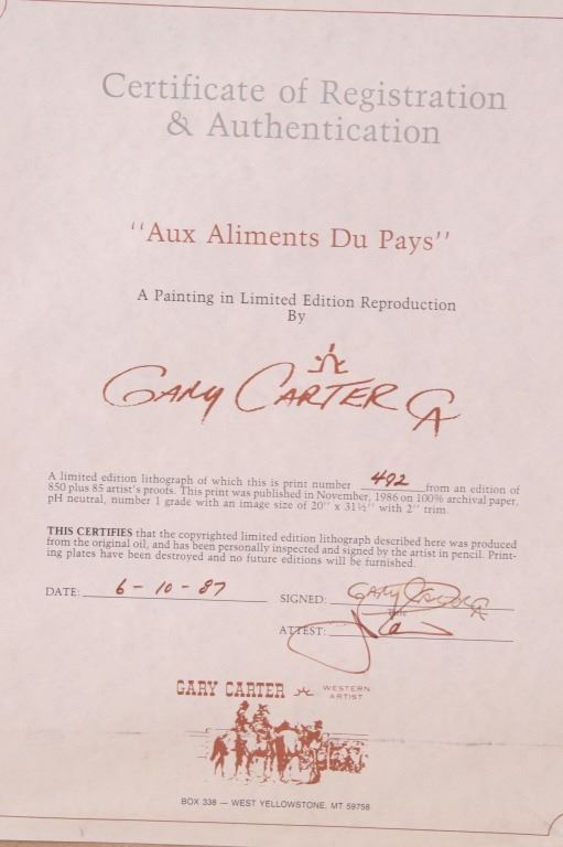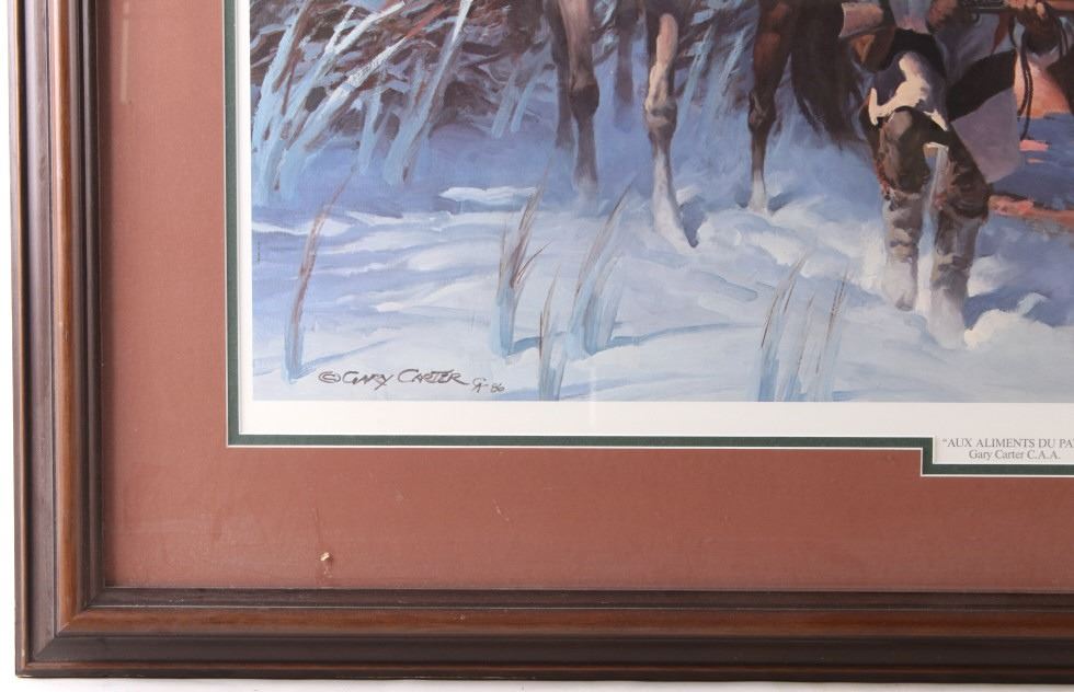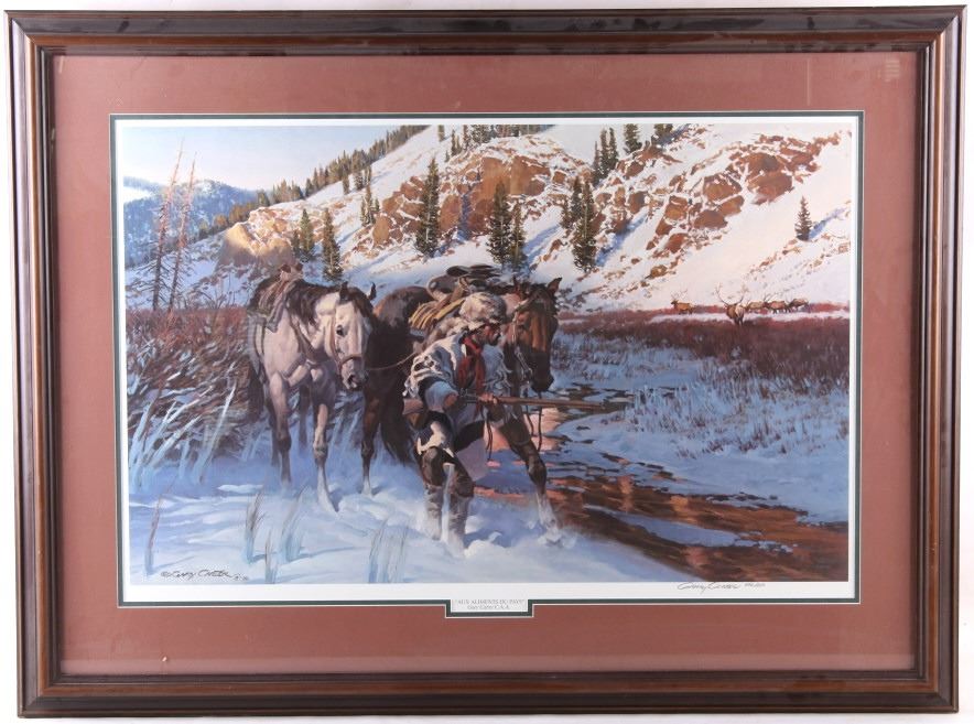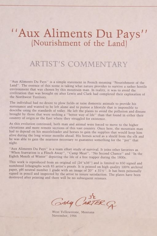 For your consideration is this Limited Edition Lithograph from 1986 called "Aux Aliments Du Pays," by Gary Carter. "Aux Aliments Du Pays" is a simple statement in French meaning "Nourishment of the Land". The essence of this scene is taking what nature provides to survive a rather hostile environment that was chosen by the mountain man. In reality, it was to avoid the civilization that was brought on after Lewis and Clark had completed their exploration of the Northwest Territory. This litho print numbers 492/850 with 85 artist proofs. The measurements of this framed 31" x 41 1/2" and the visible art measures 21 1/2" x 31 1/2".