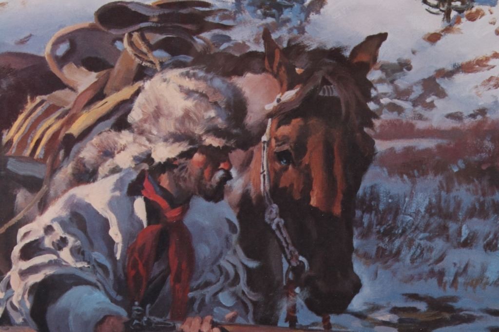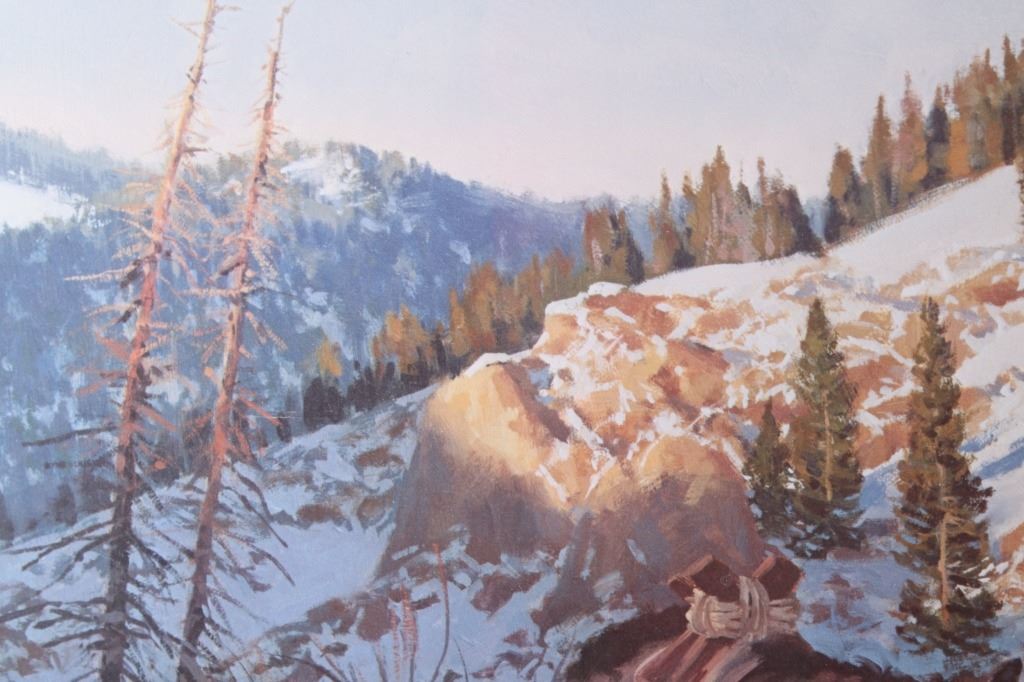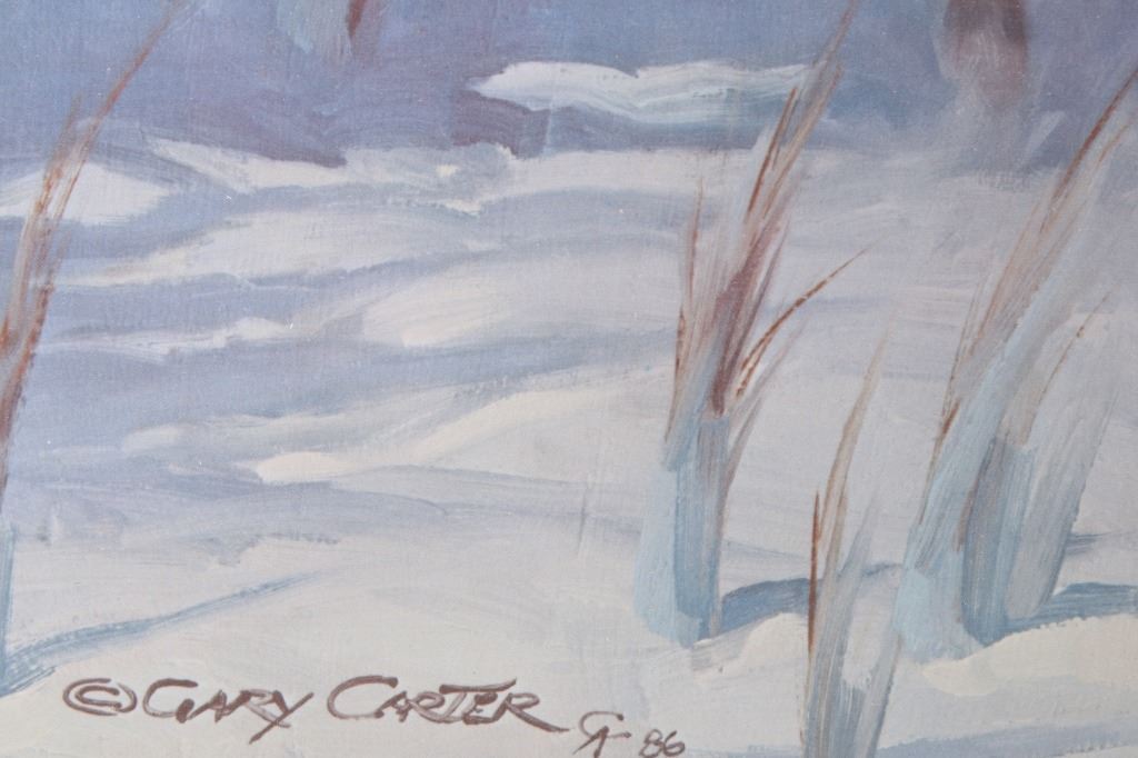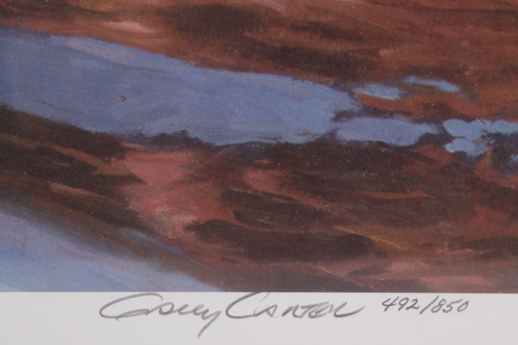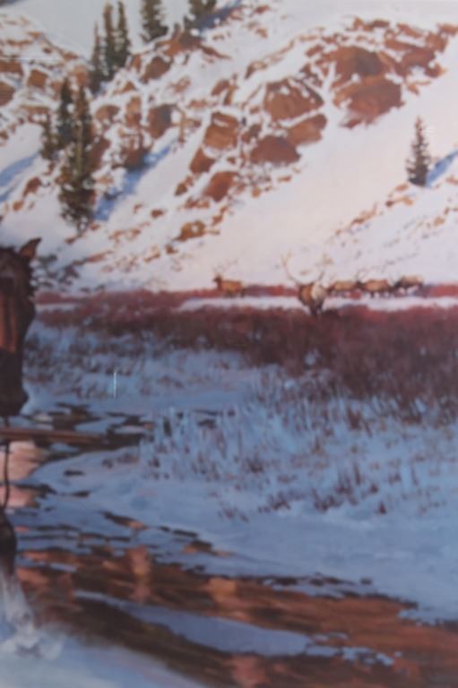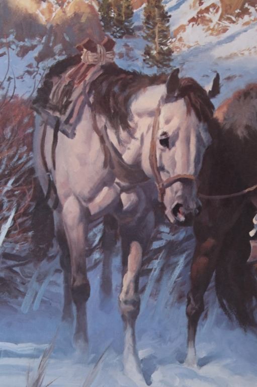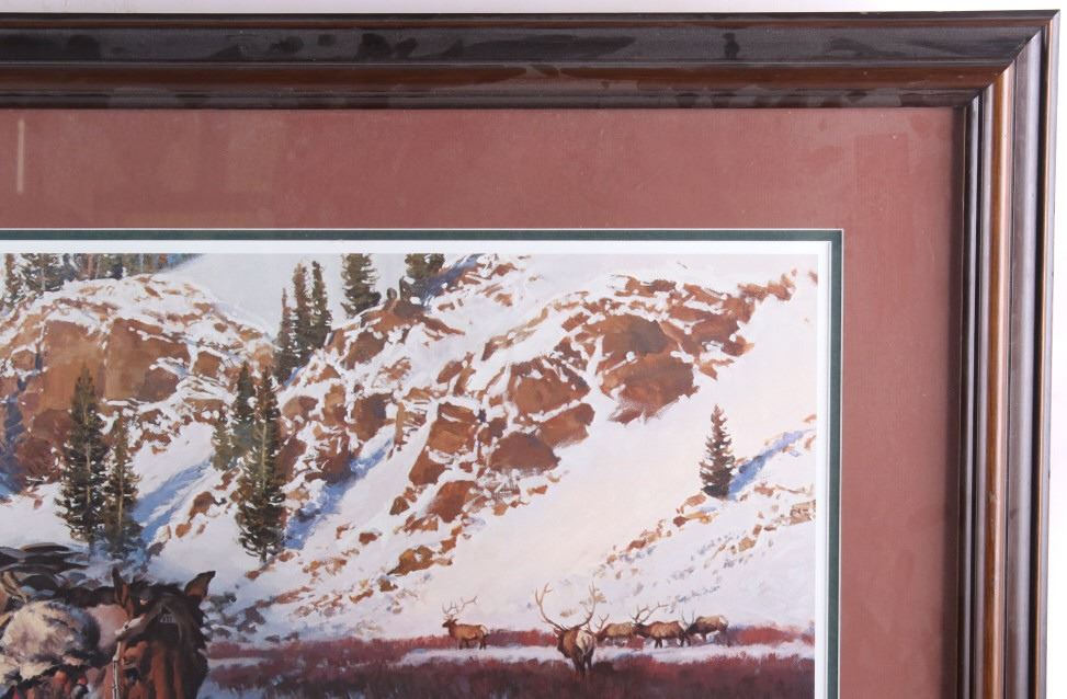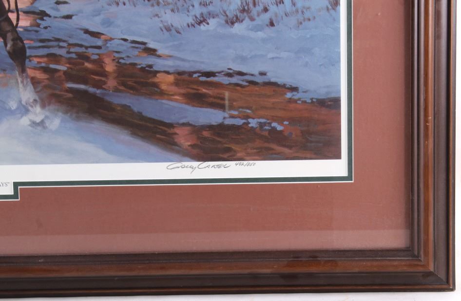 For your consideration is this Limited Edition Lithograph from 1986 called "Aux Aliments Du Pays," by Gary Carter. "Aux Aliments Du Pays" is a simple statement in French meaning "Nourishment of the Land". The essence of this scene is taking what nature provides to survive a rather hostile environment that was chosen by the mountain man. In reality, it was to avoid the civilization that was brought on after Lewis and Clark had completed their exploration of the Northwest Territory. This litho print numbers 492/850 with 85 artist proofs. The measurements of this framed 31" x 41 1/2" and the visible art measures 21 1/2" x 31 1/2".