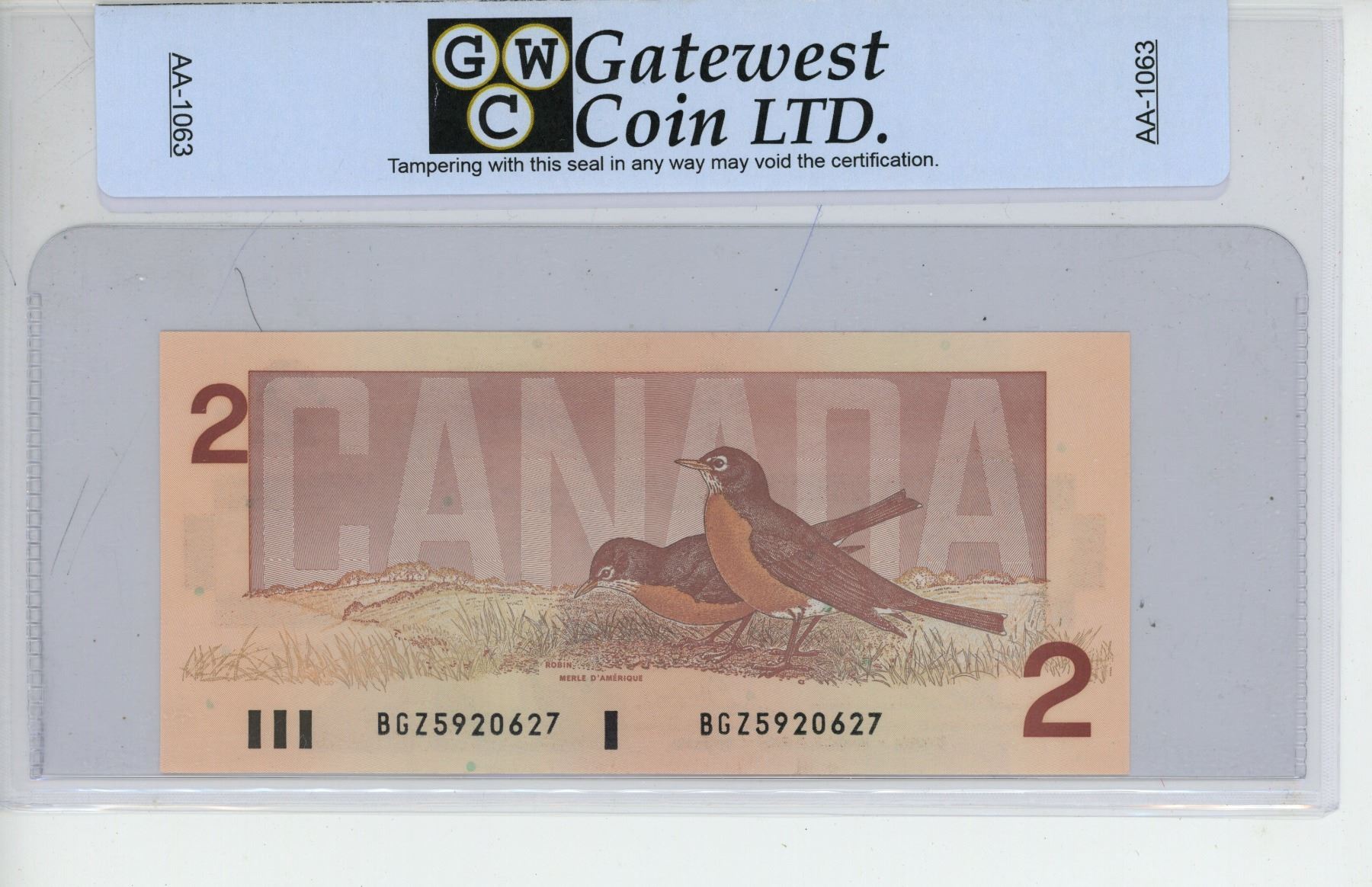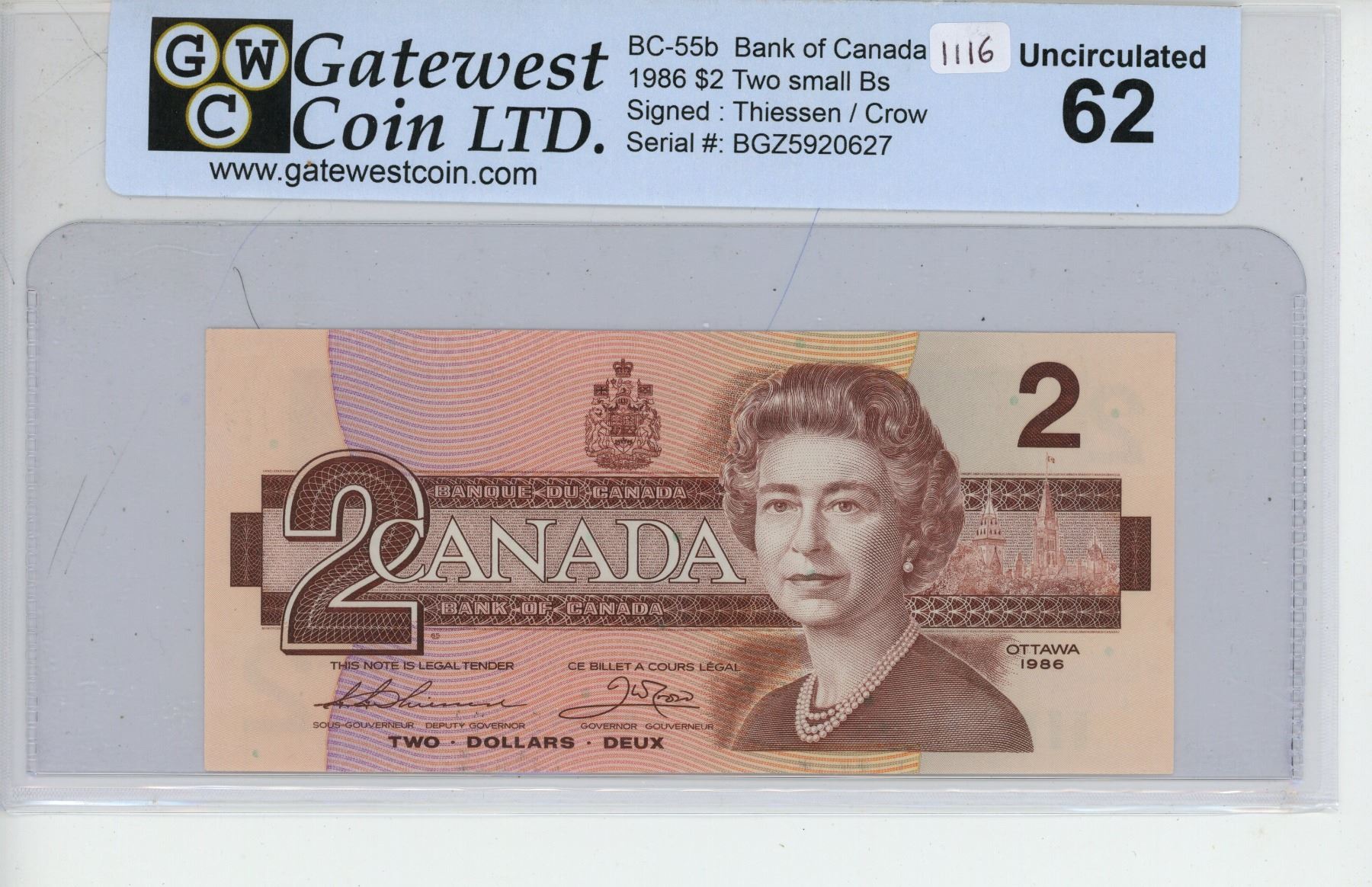 1986 BC-55b 2 dollar, Thiessen-Crow, Two Small Bs, BGZ5920627 UNC-62