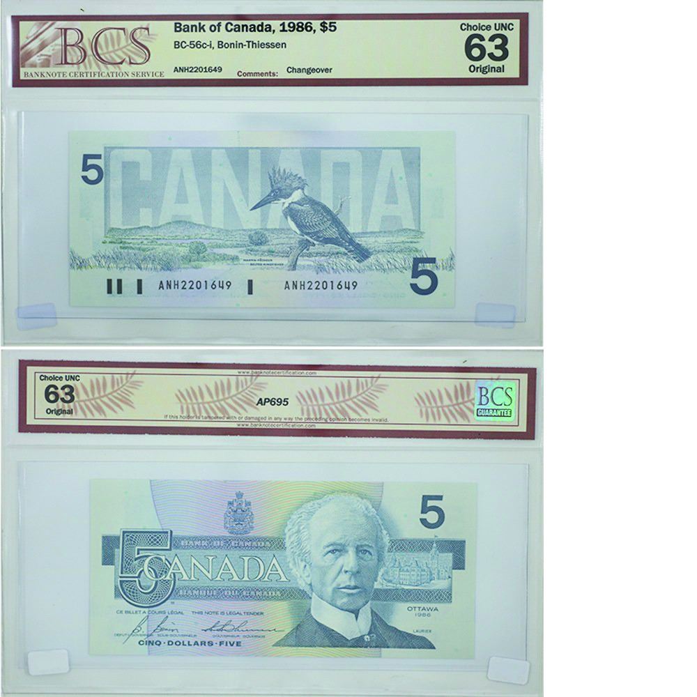 1986 Bank of Canada $5 Changeover note. BC-56c-i, Bonin-Thiessen, Prefix ANH, BCS CUNC-63, Original.