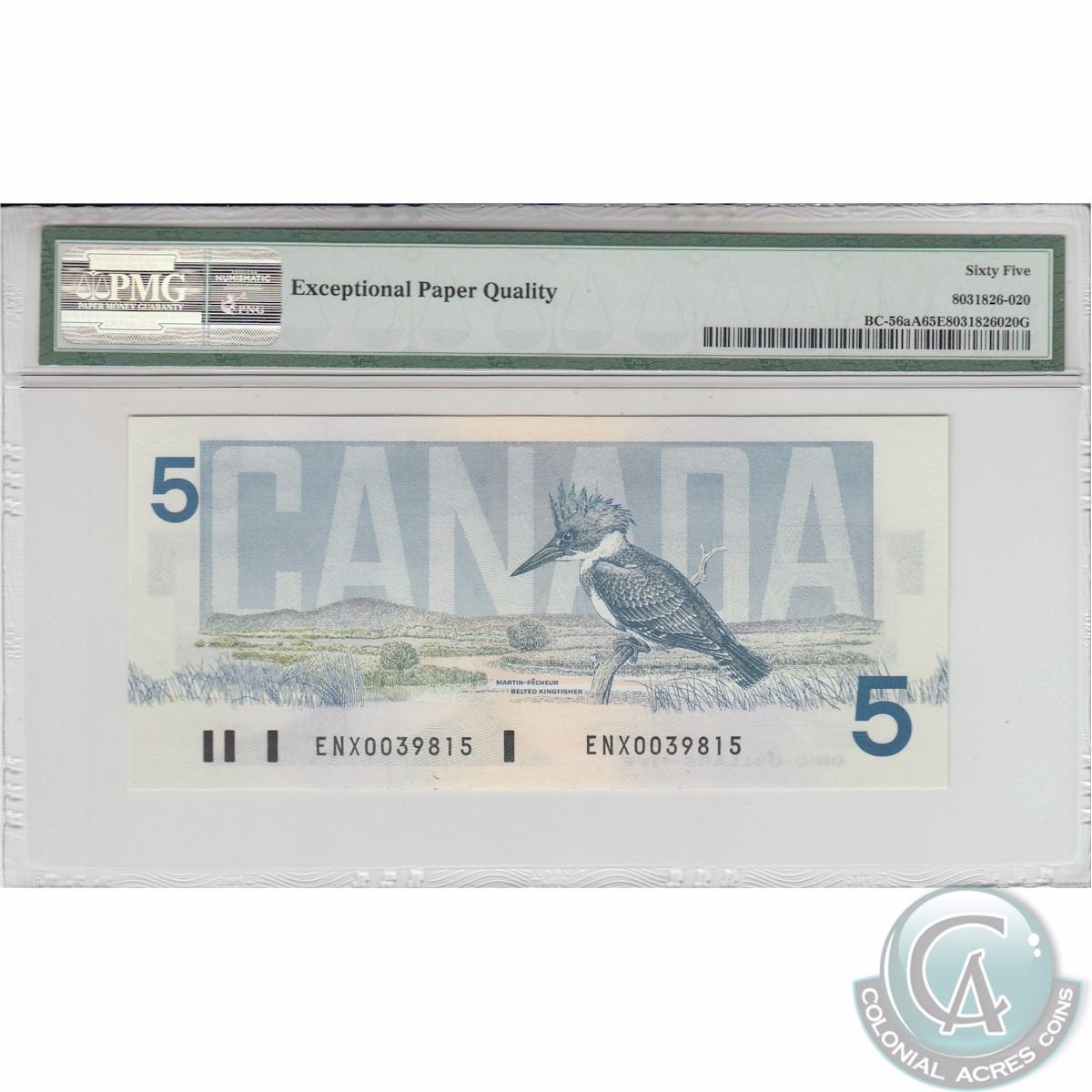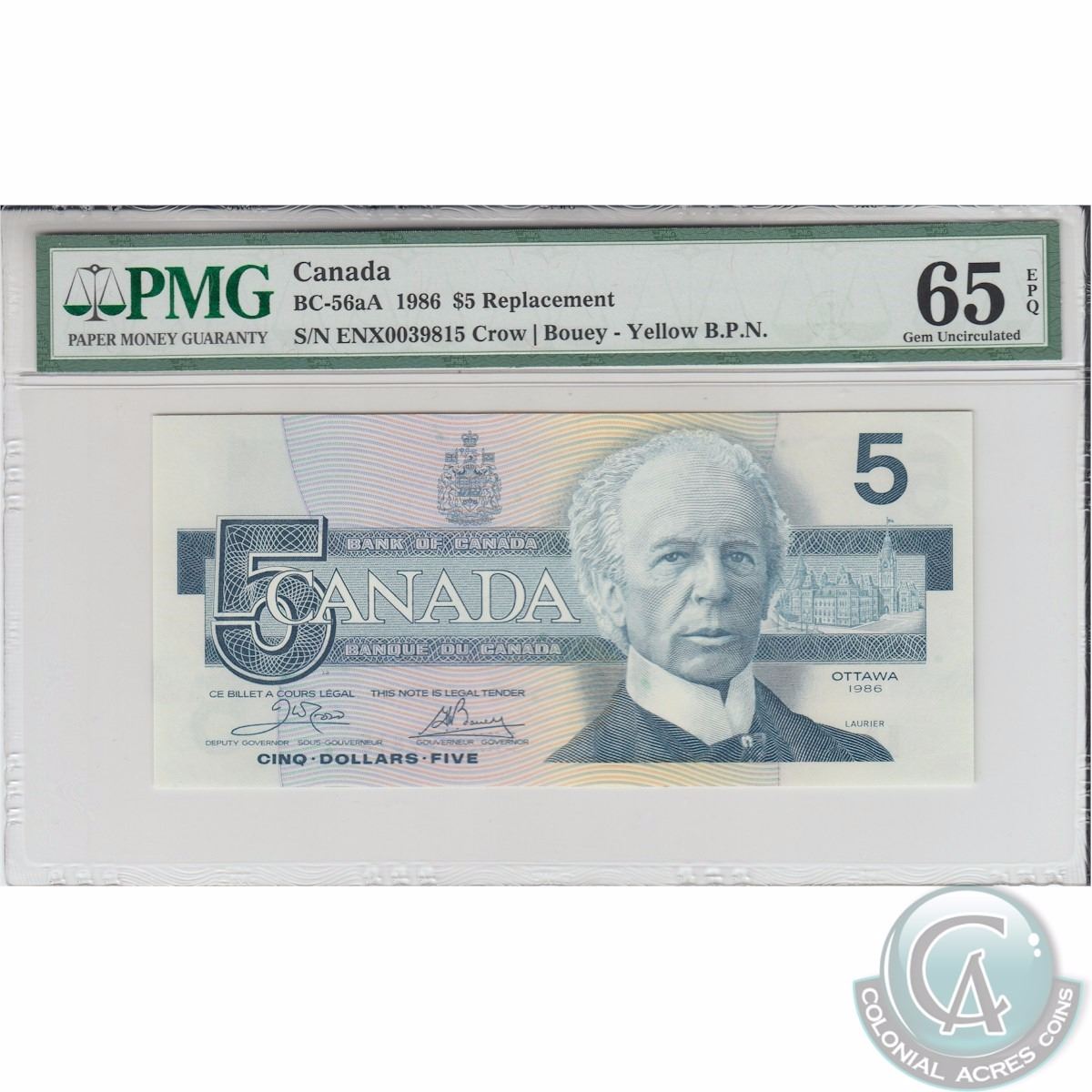 1986 Bank of Canada $5 Crow-Bouey 'ENX' Replacement BC-56aA, Yellow B.P.N. PMG Certified Gem UNC-65 EPQ!