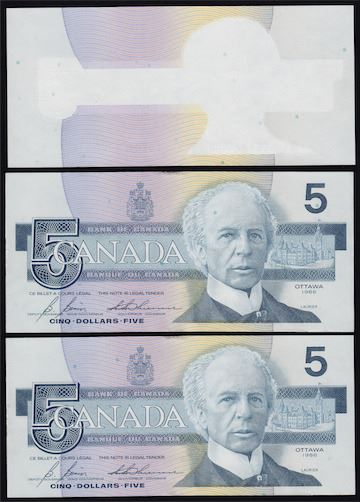 CH BC-Ei-v. Missing the dark blue intaglio printing on the front, Uncirculated. S/N: GOE6974040. Included is a pair of other $5's with close serial numbers (GOE6974000 & GOE6974001). 3 Pcs.