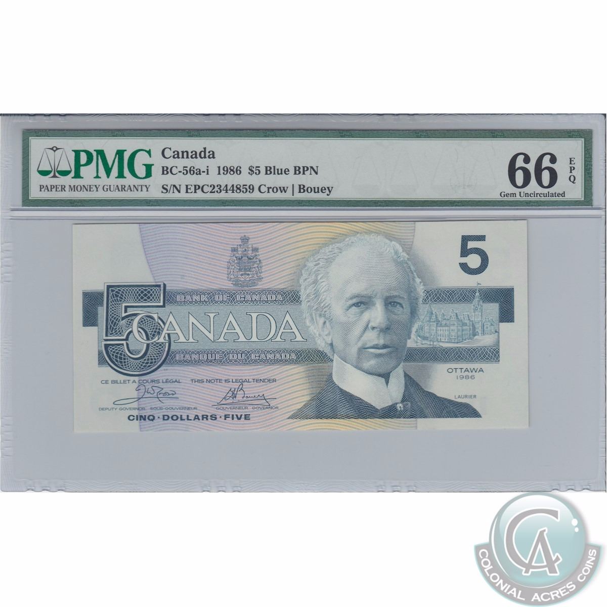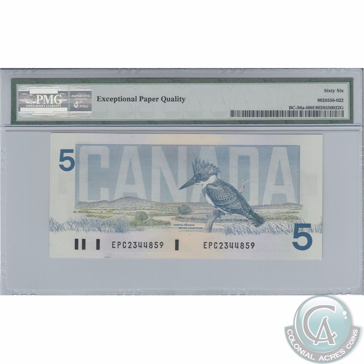 1986 Bank of Canada Changeover $5. BC-56a-i, Crow-Bouey, S/N: EPC2344859, PMG GUNC-66, EPQ