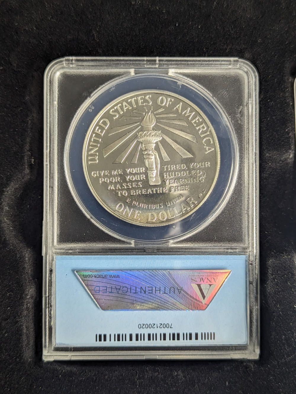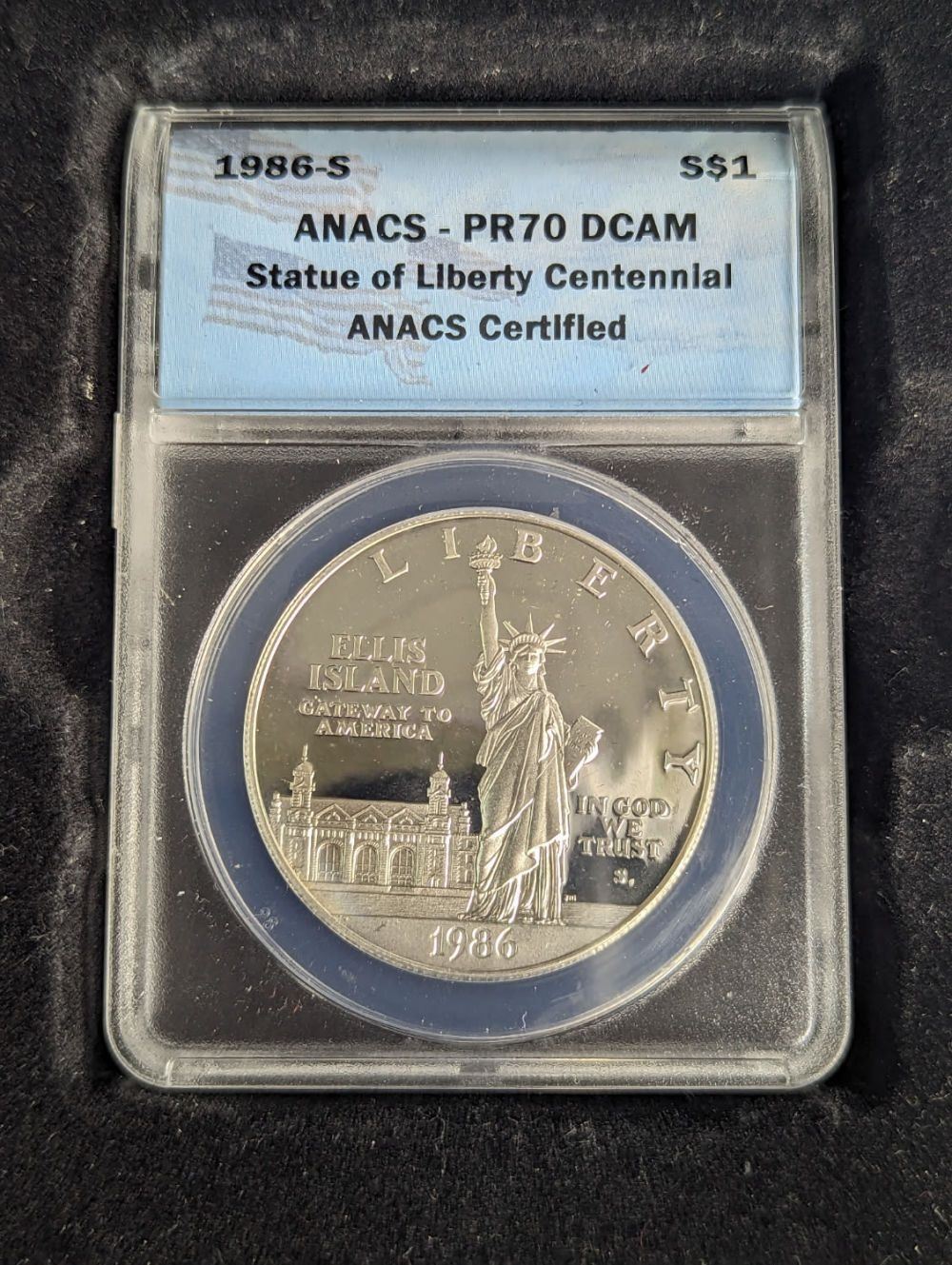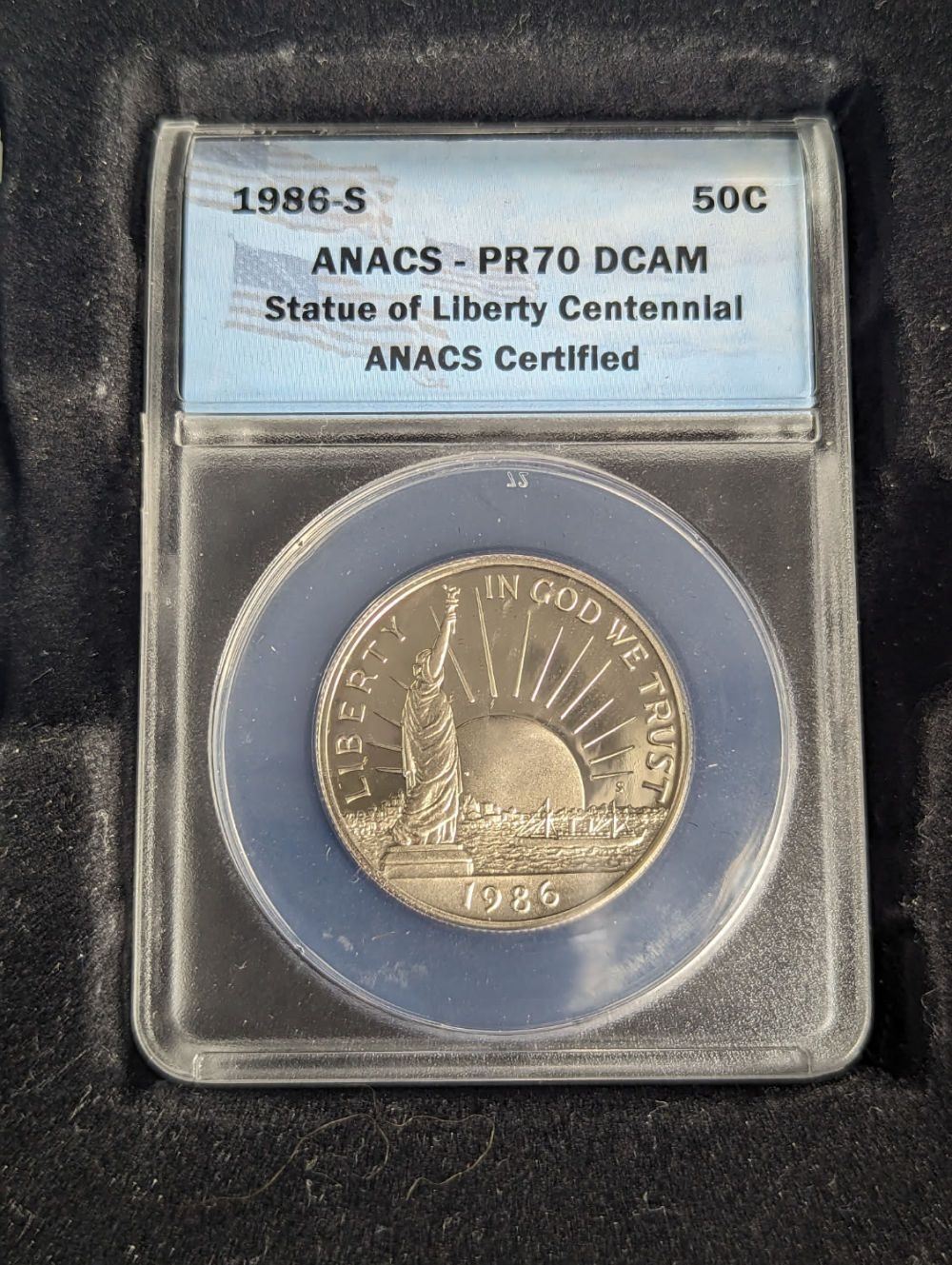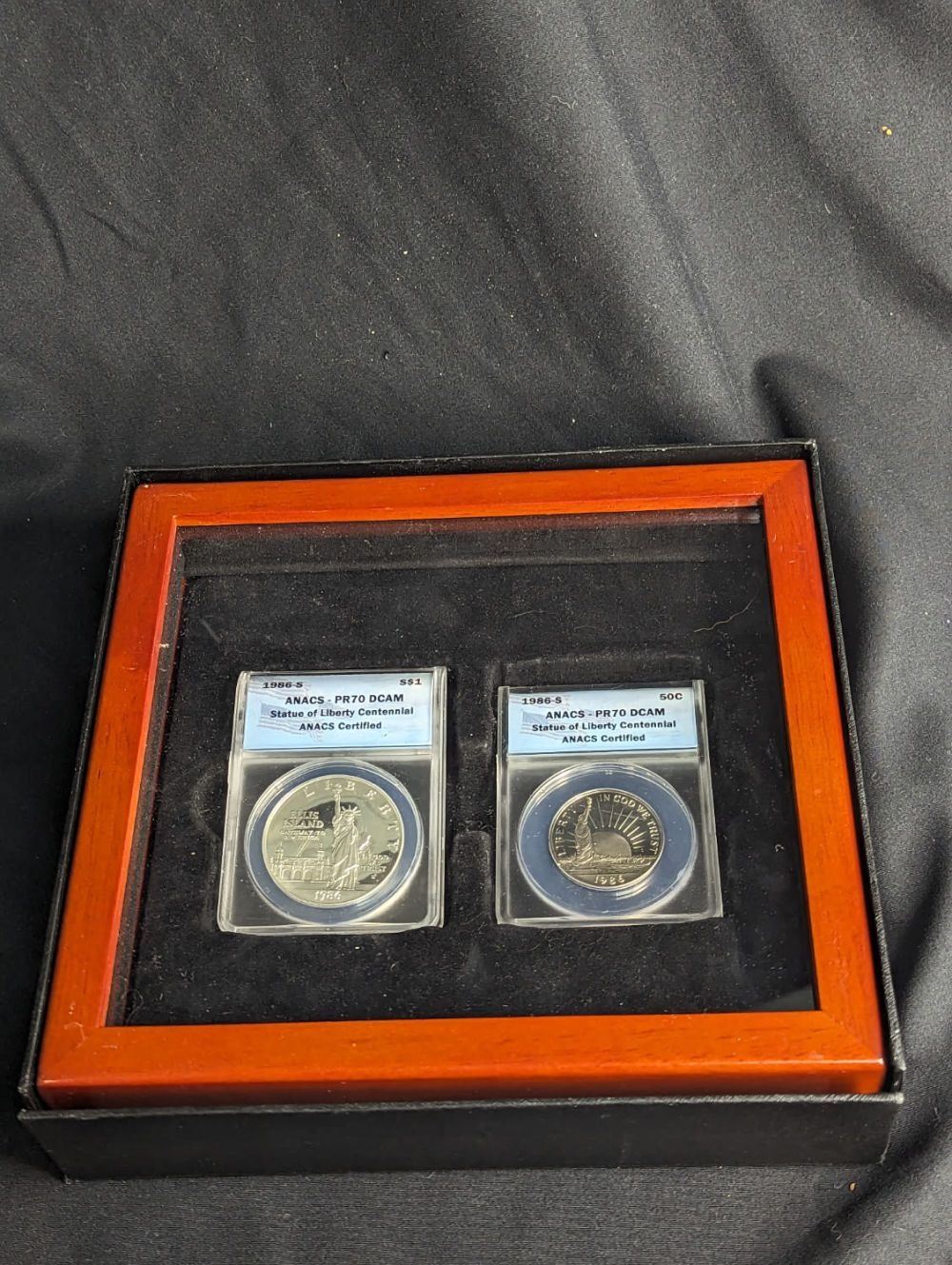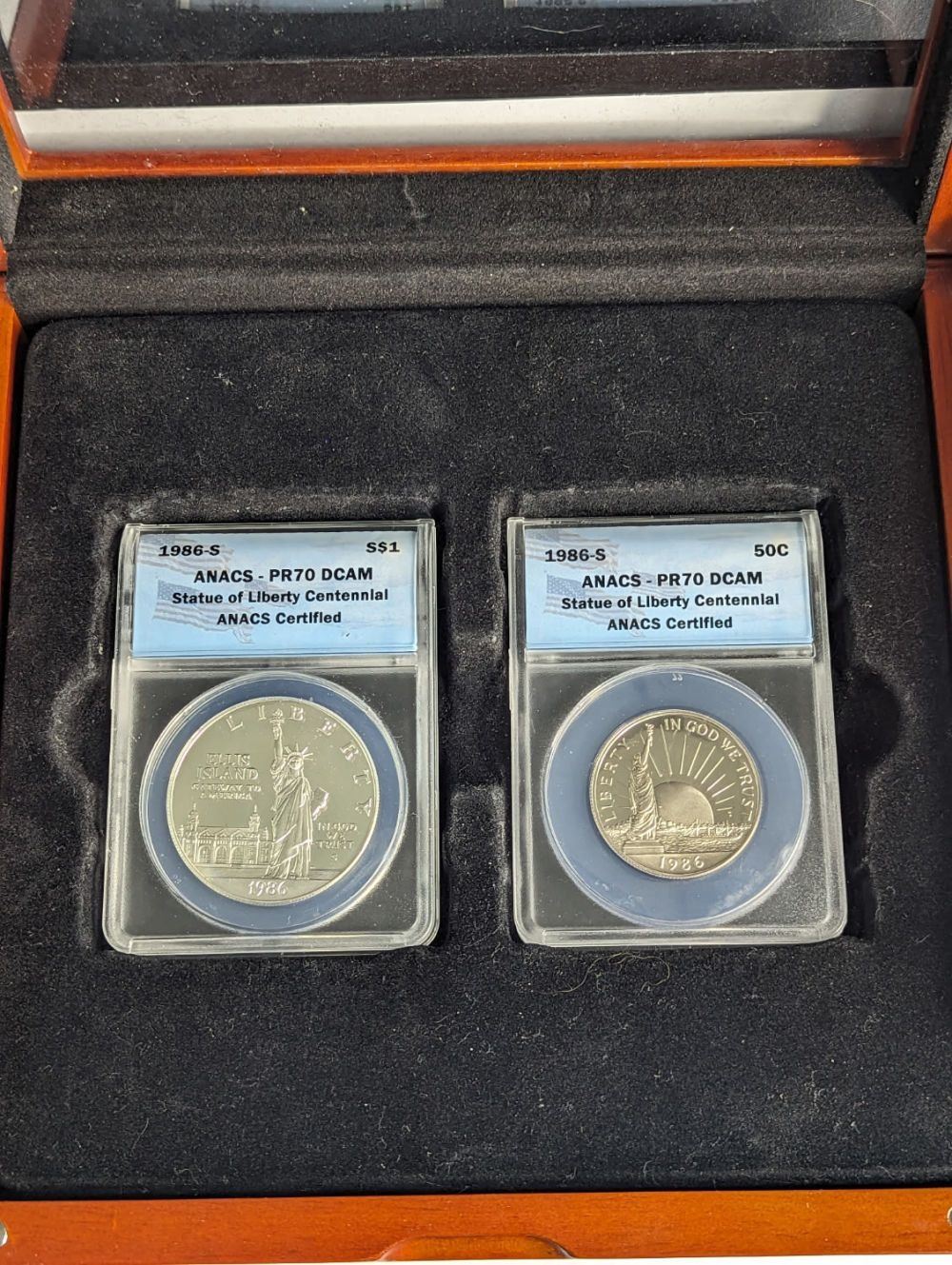 A 1986 Bicentennial 2 PC Statue Of Liberty Commemorative Set Anacs Graded PR70. This set comes with the Statue of Liberty Dollar Commemorative and the Half Dollar Commemorative Coins in a Beautiful Wooden Box