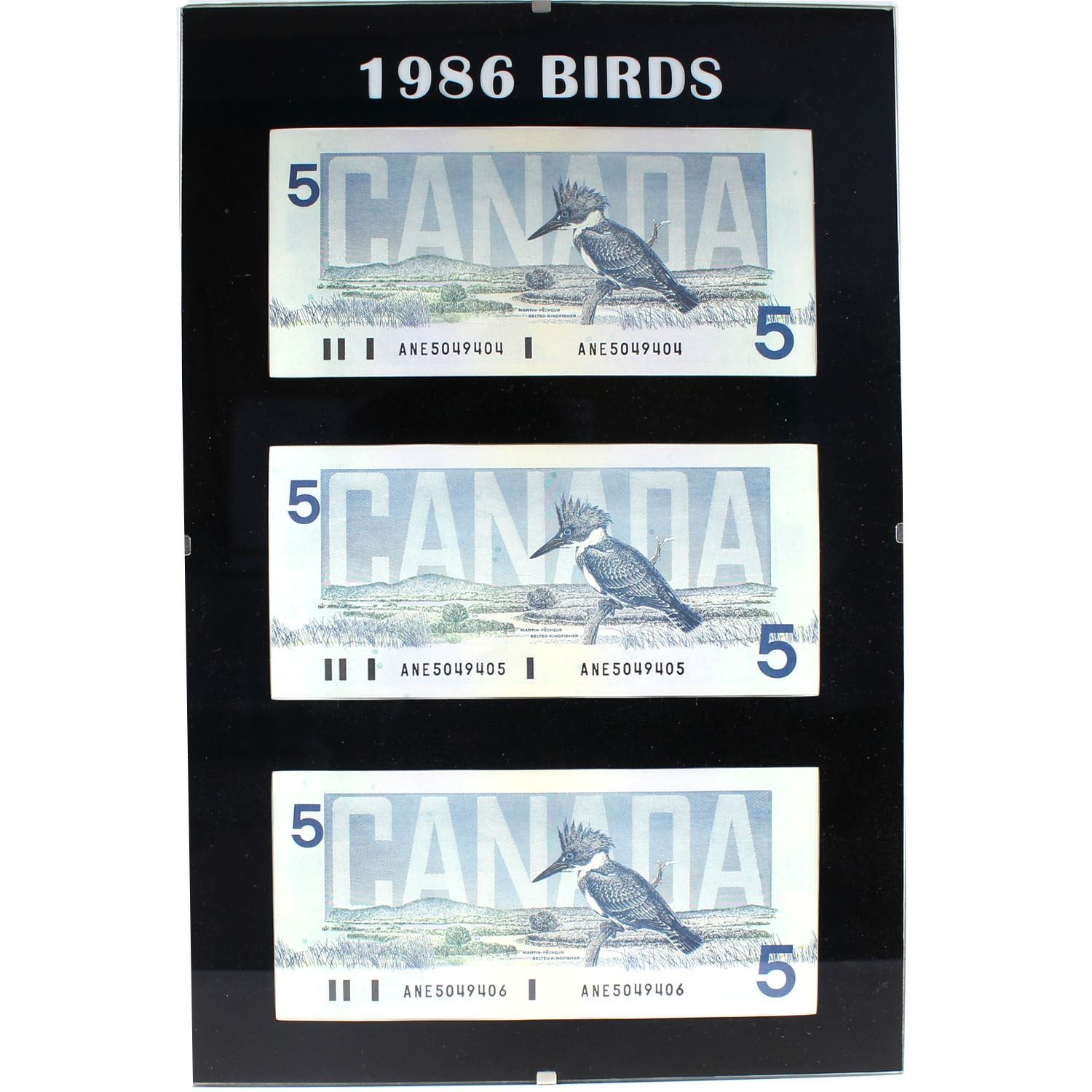 *1986 Birds of Canada $5 4-Digit RADAR Serial Number Banknote Set in Hard Plastic Holder Featuring the Serial Number ANE5049405 with Accomponying Shoulder Notes Ending in 404 & 406.
