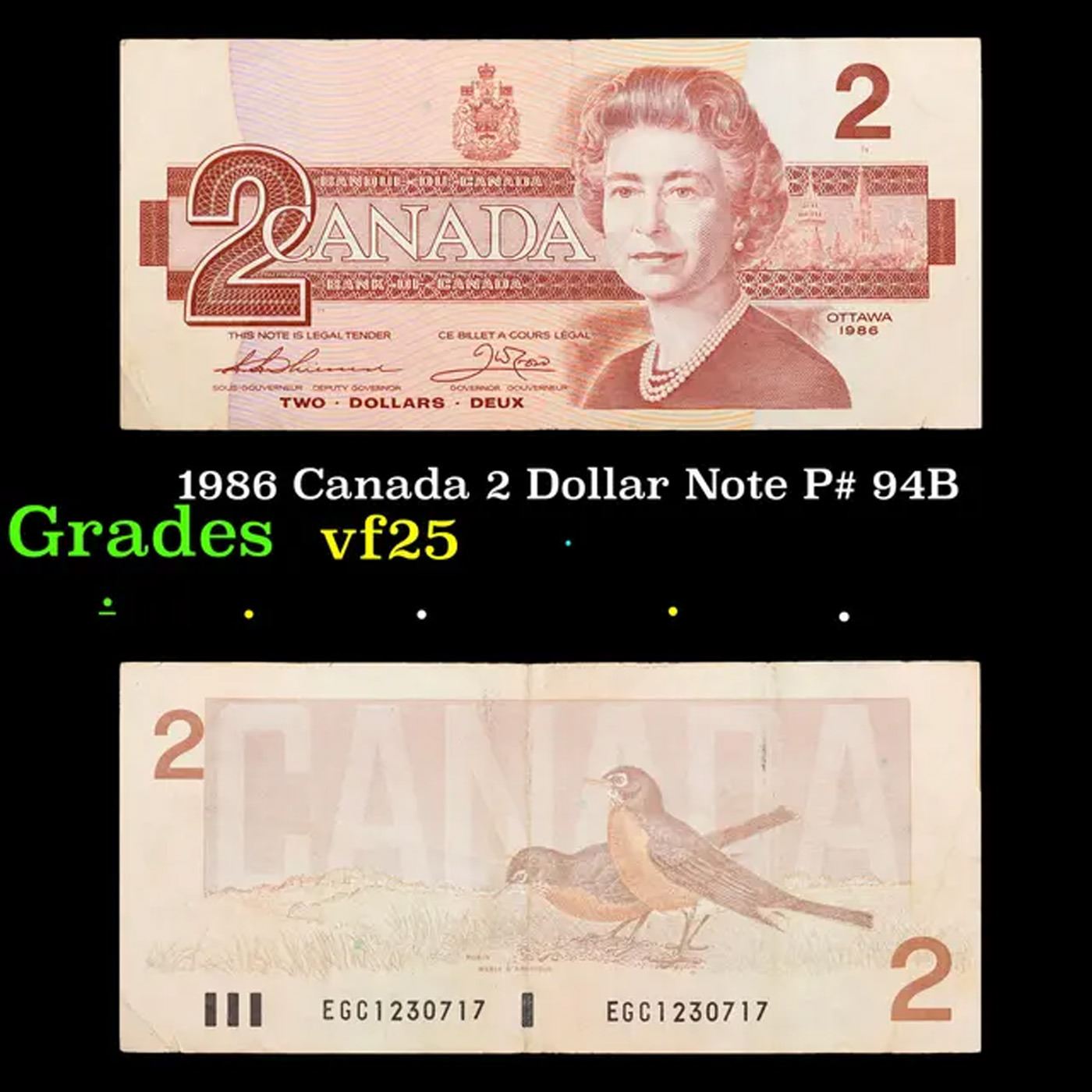 1986 Canada 2 Dollar Note P# 94B Grades vf+.
