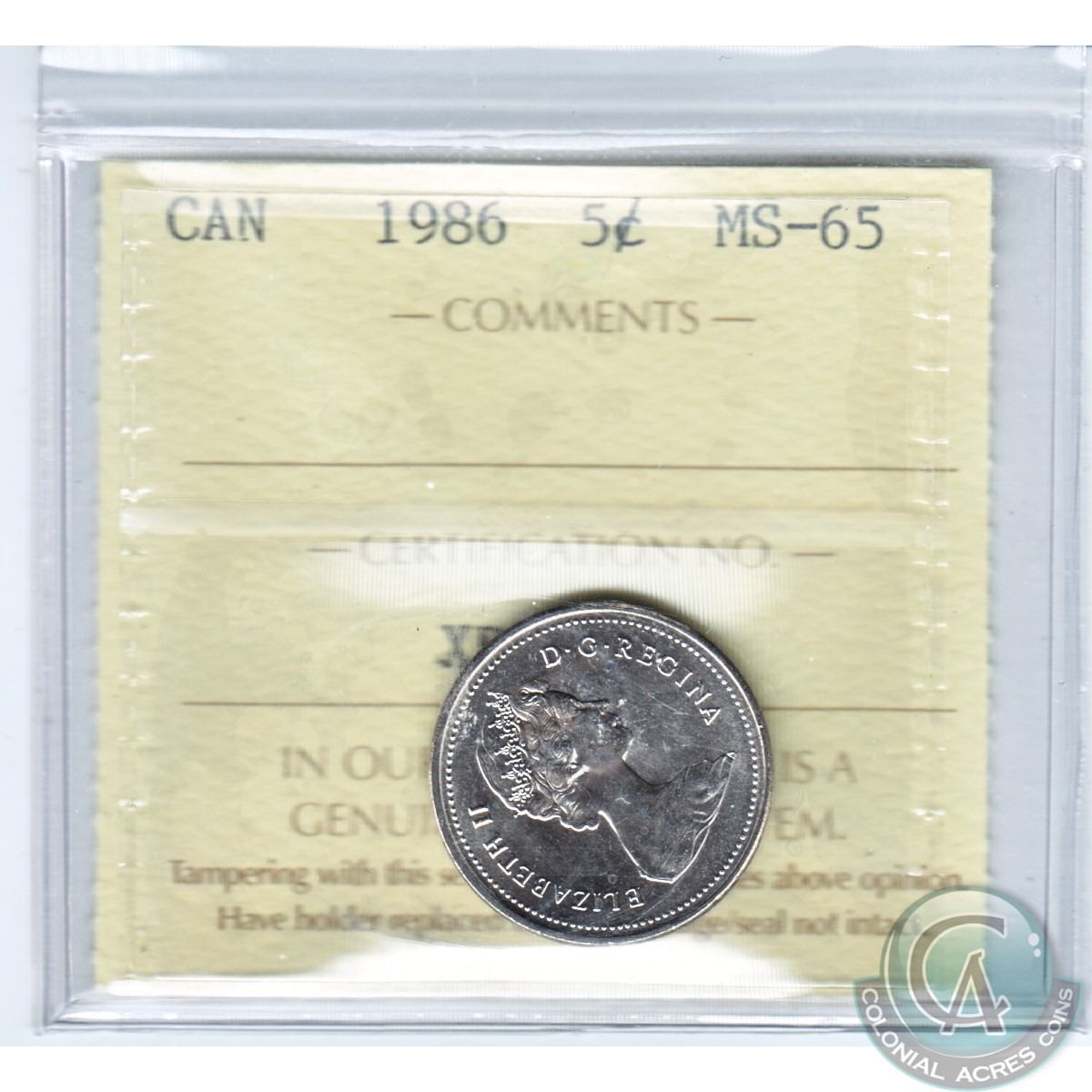 1986 Canada 5-cent ICCS Certified MS-65