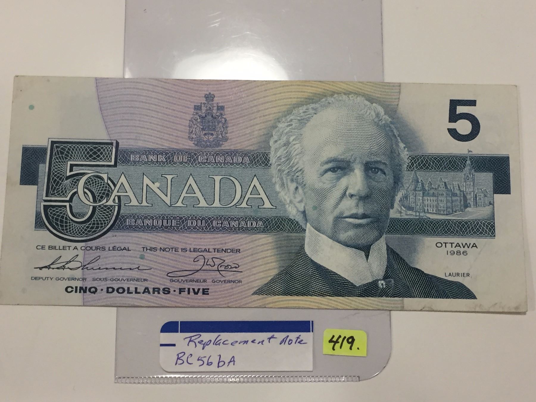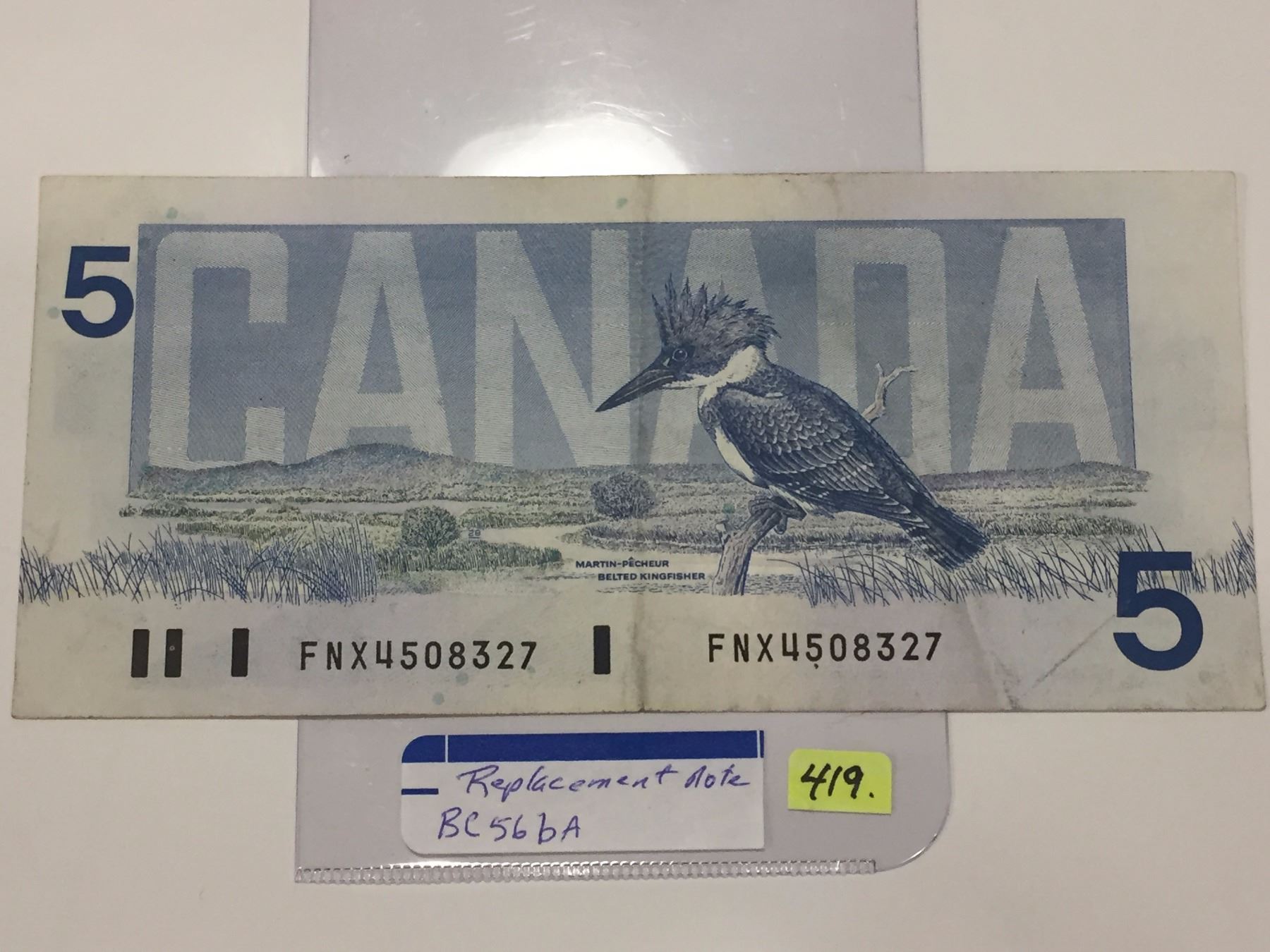 1986 Canada Five Dollar Bill; SN FNX 4508327; Replacement Note