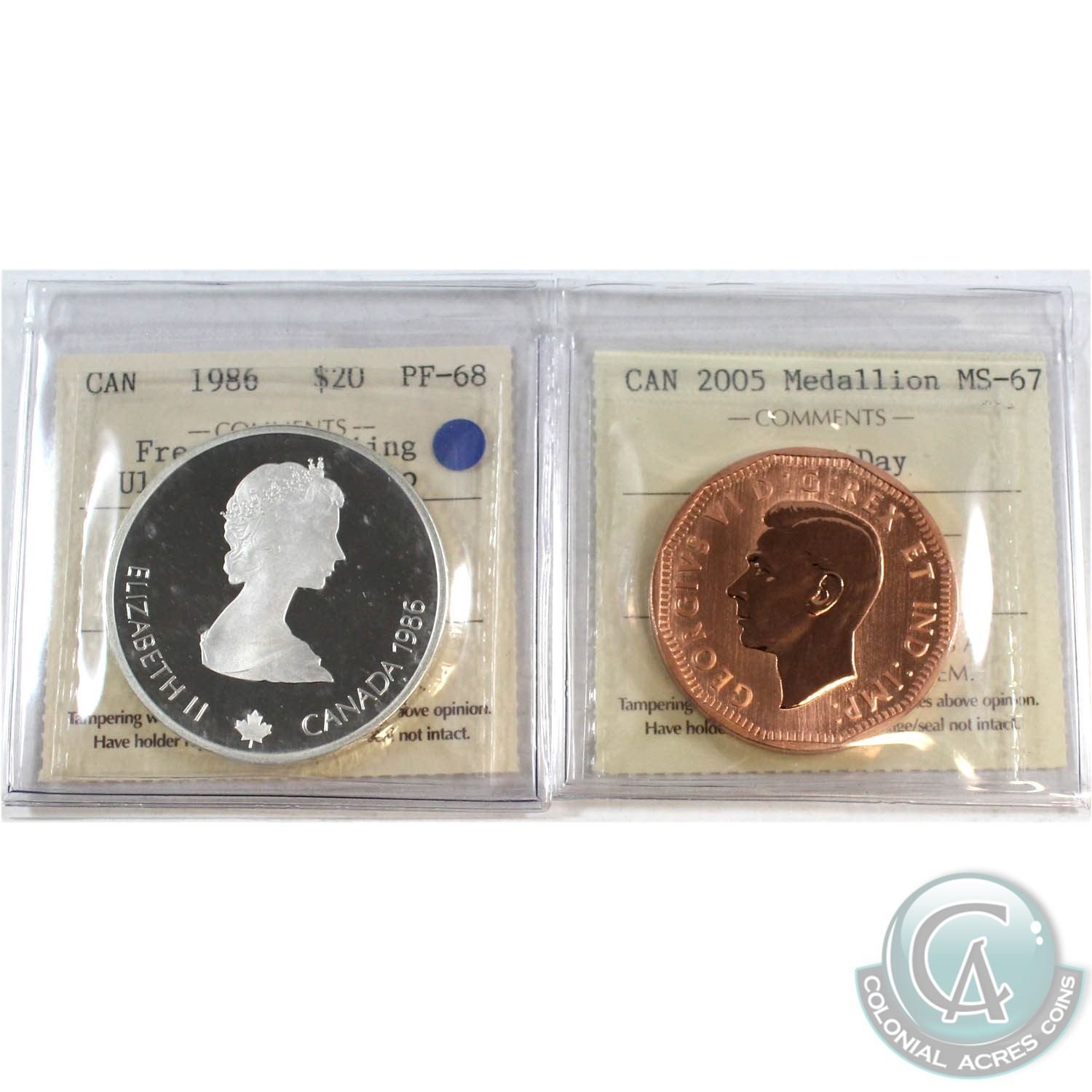 1986 Canada Freestyle Skiing $20 PF-68 UHC & 2005 Canada VE-Day Medallion MS-67. Both coins have been certified by ICCS.