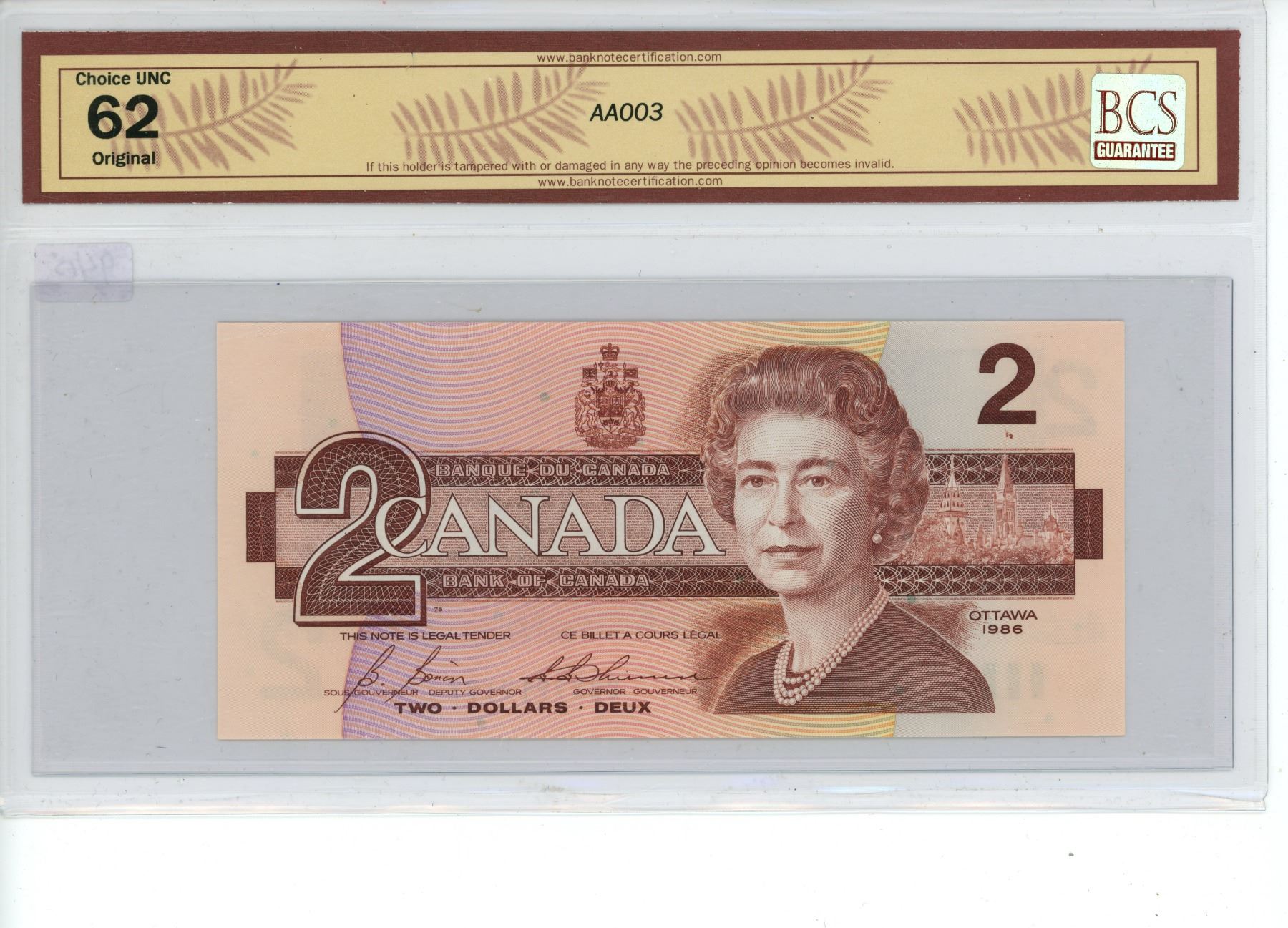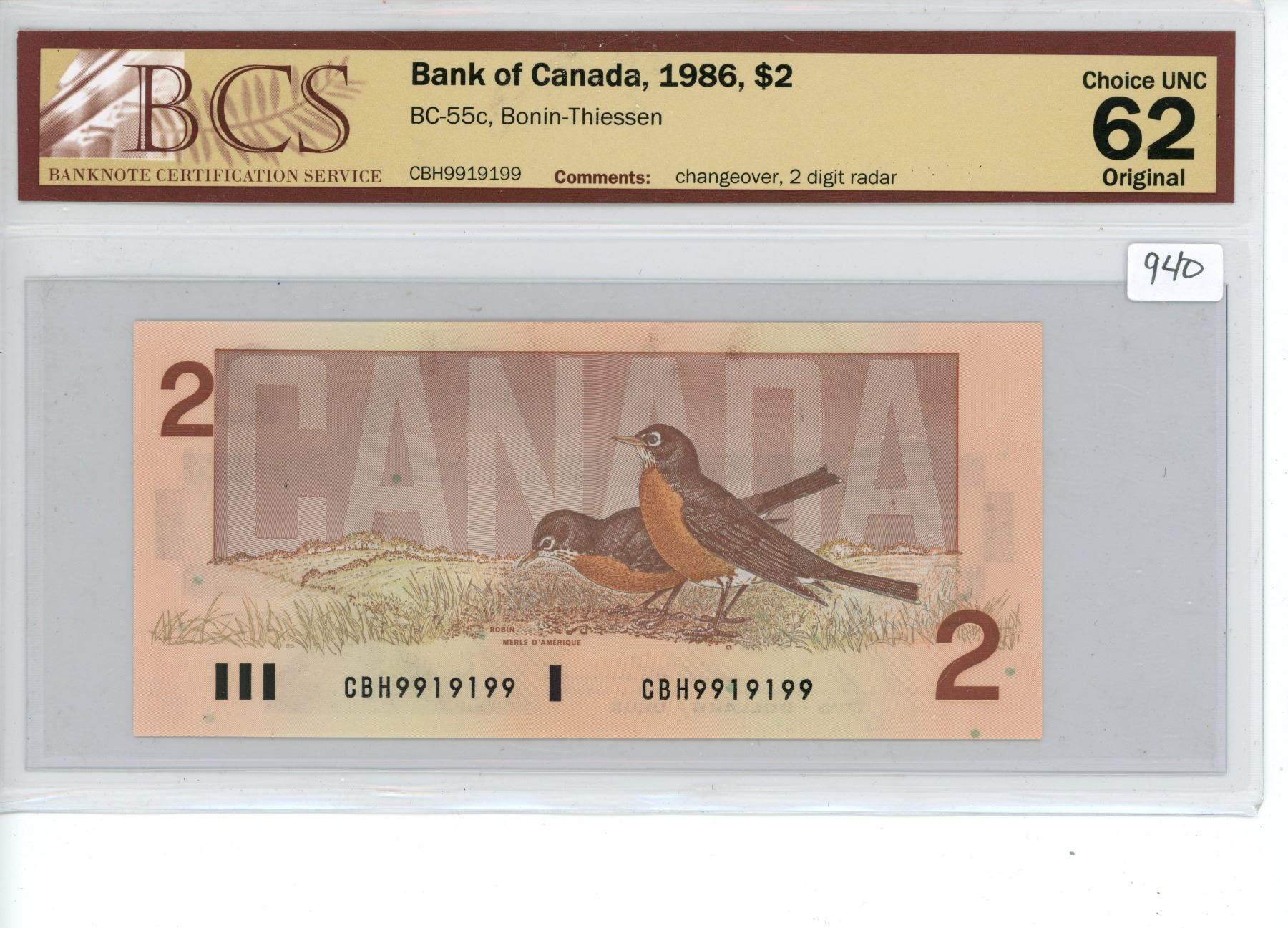 1986 Canadian $2 Bill - BCS Graded, Changeover, 2 digit Radar Serial #, Choce UNC 62