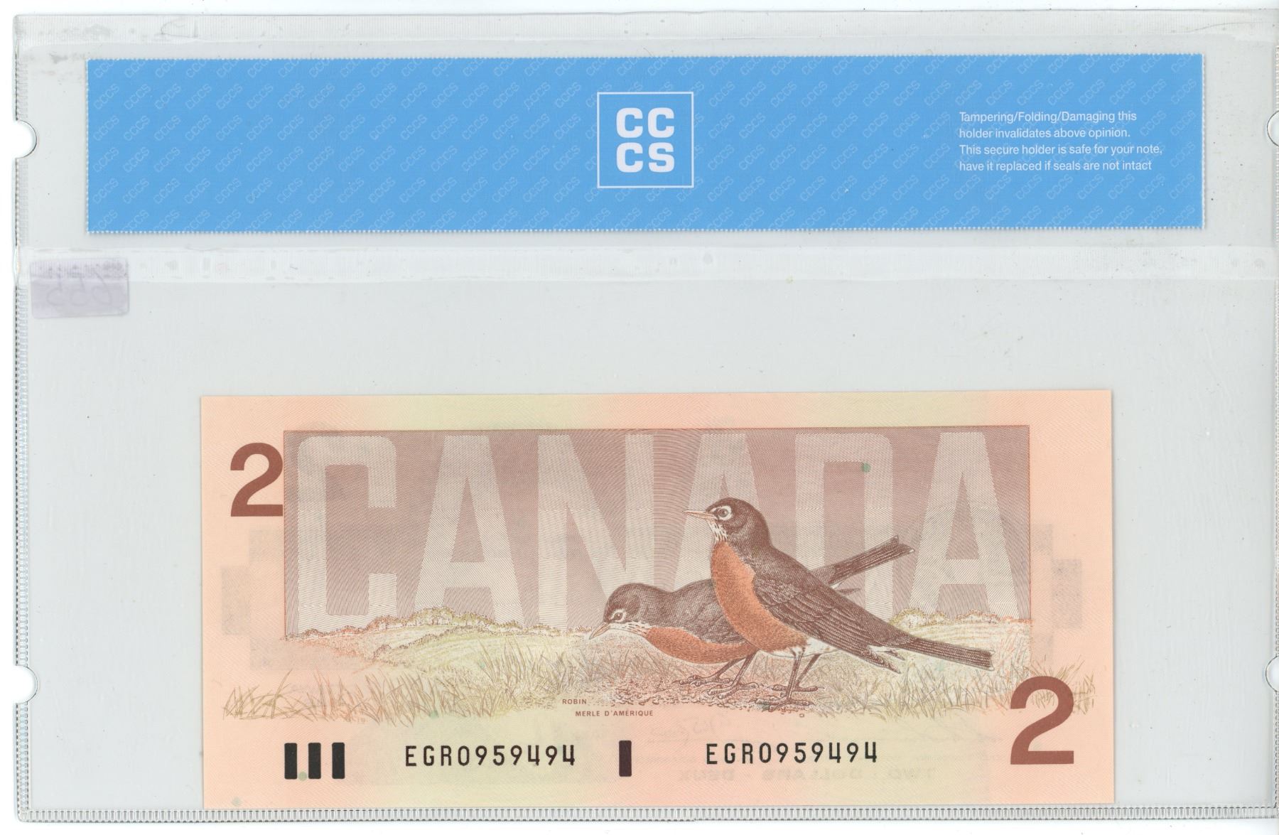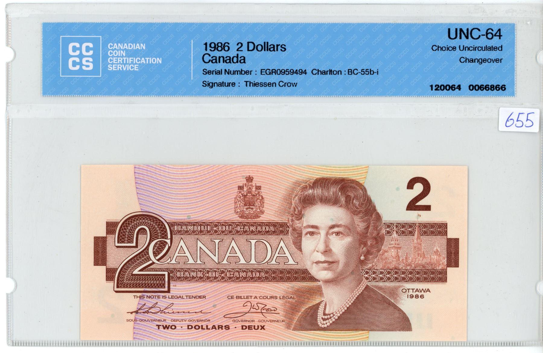 1986 Canadian 2 dollar bill - Thiessen/Crow - Prefix EGR 0959494 - CCCS graded UNC-64