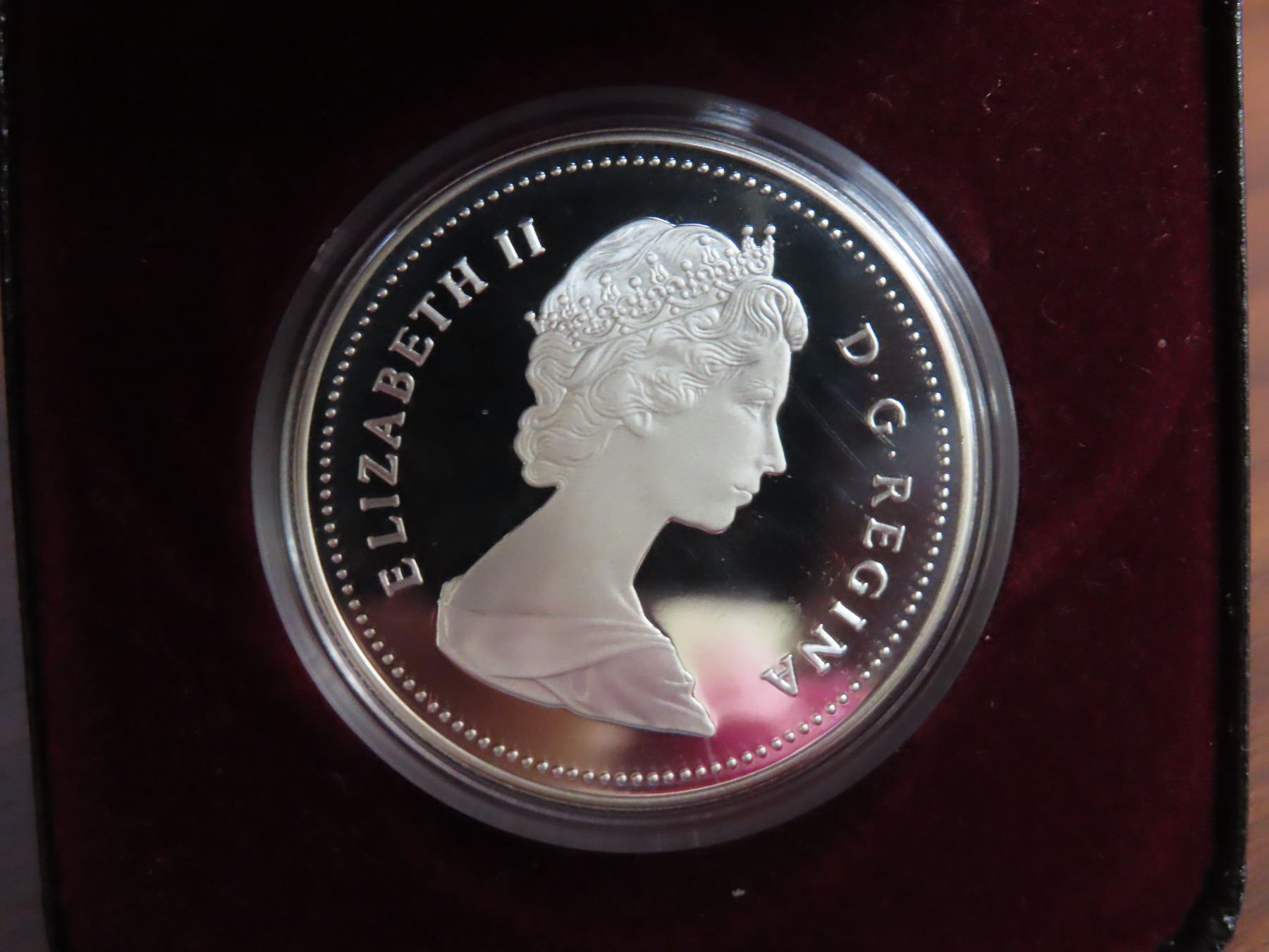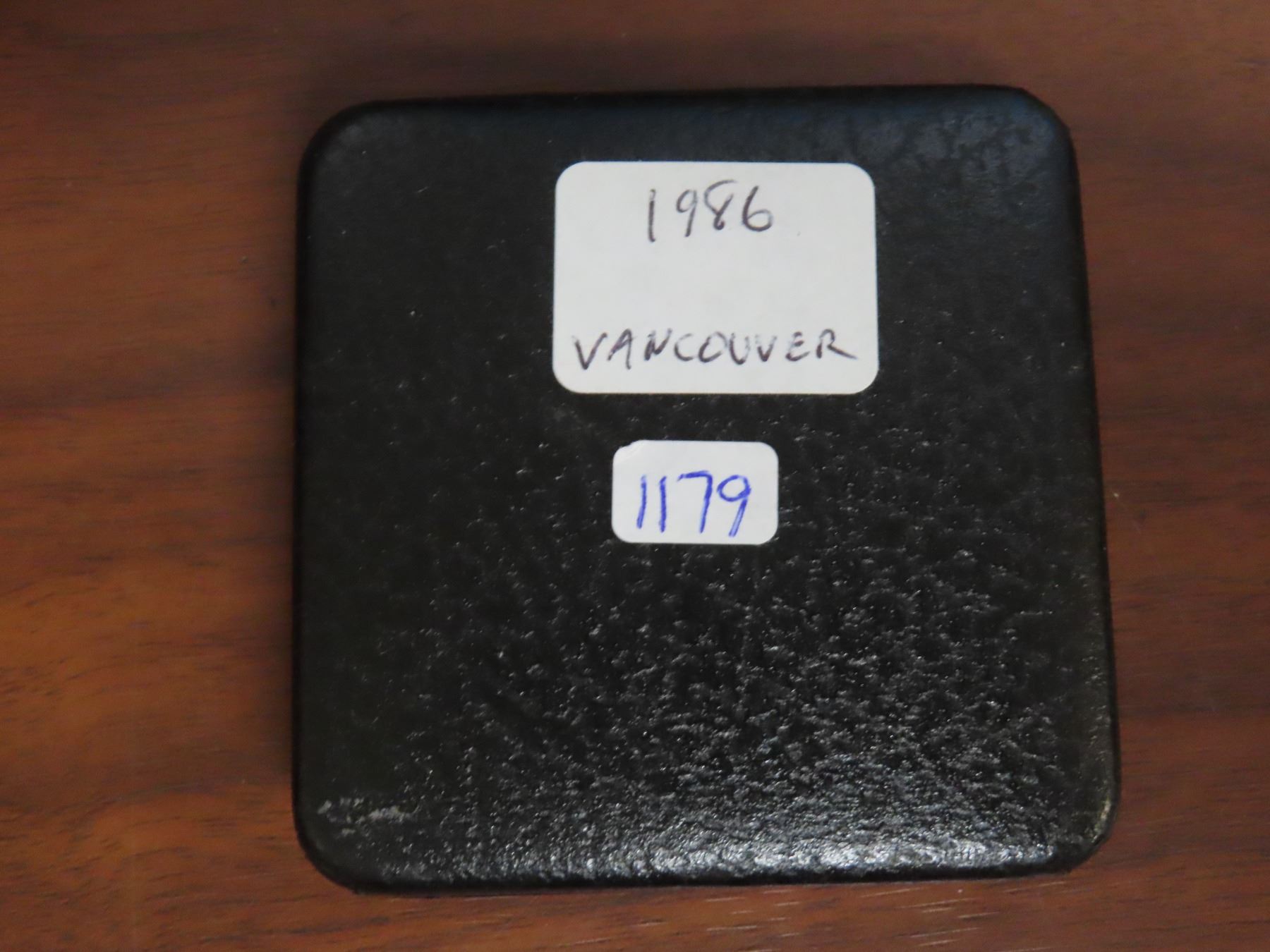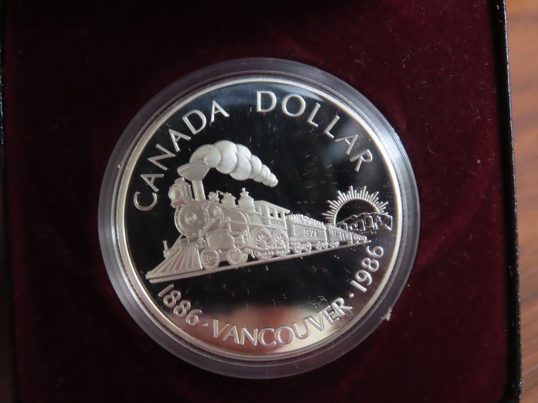 1986 Canadian Proof Silver Dollar. Commemorates the founding of Vancouver. Train. Ultra Heavy Cameo. Hloused in its original Royal Canadian Mint case of issue.