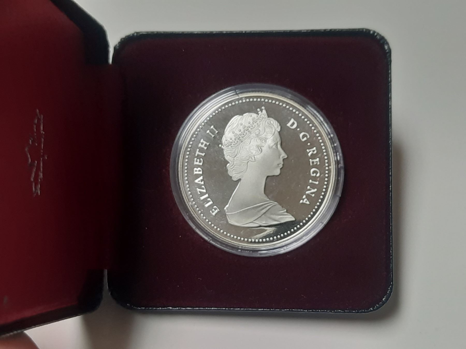 1986 Canadian Proof Silver Dollar commemorating the 100th anniversary of Vancouver and the Transcontinental Railroad.