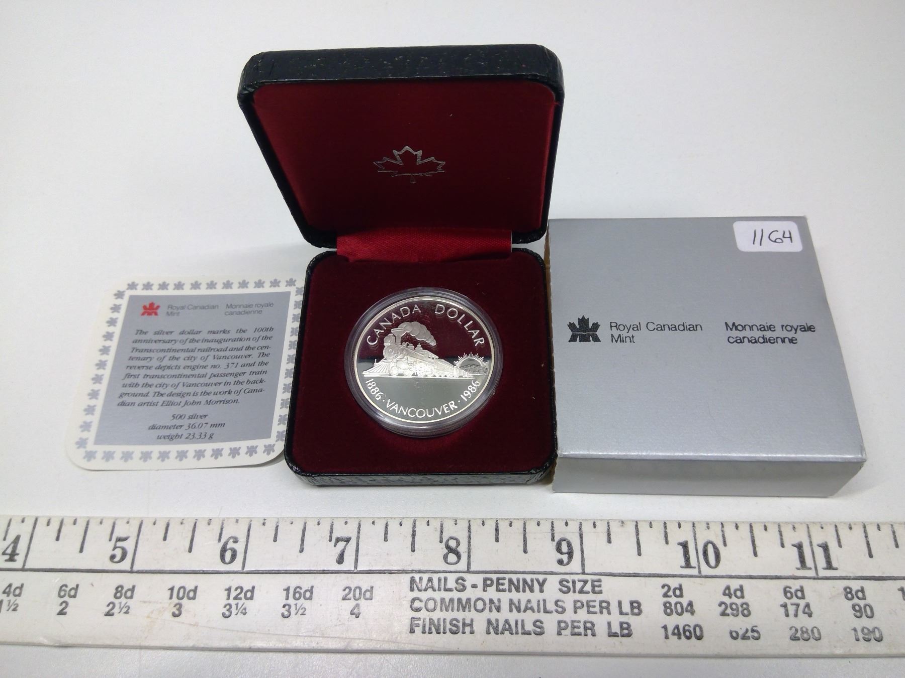 1986 Canadian Silver Dollar. Commemorates the 100th Anniversary of the inauguration of the transcontinental railroad and the Centenary of the city of Vancouver. Proof. In black case of issue.