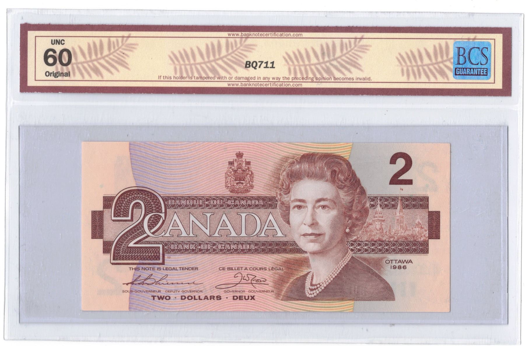 1986 Canadian Two Dollar Note - BCS Graded UNC-60