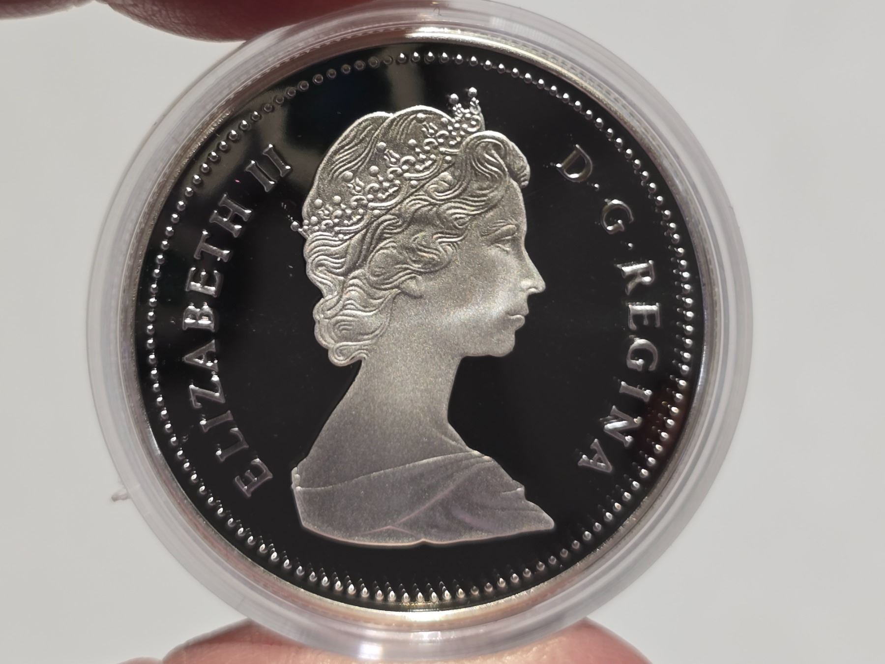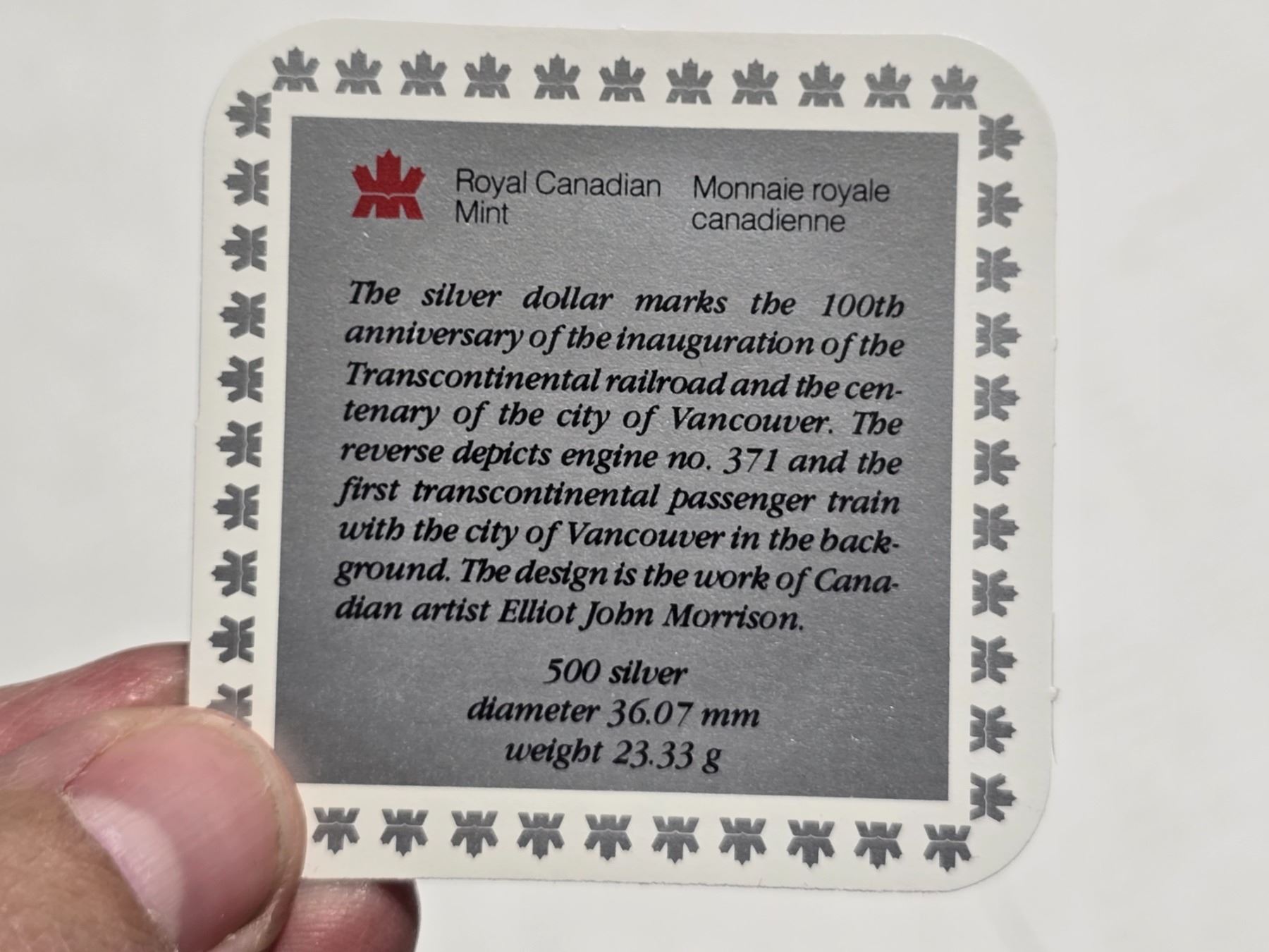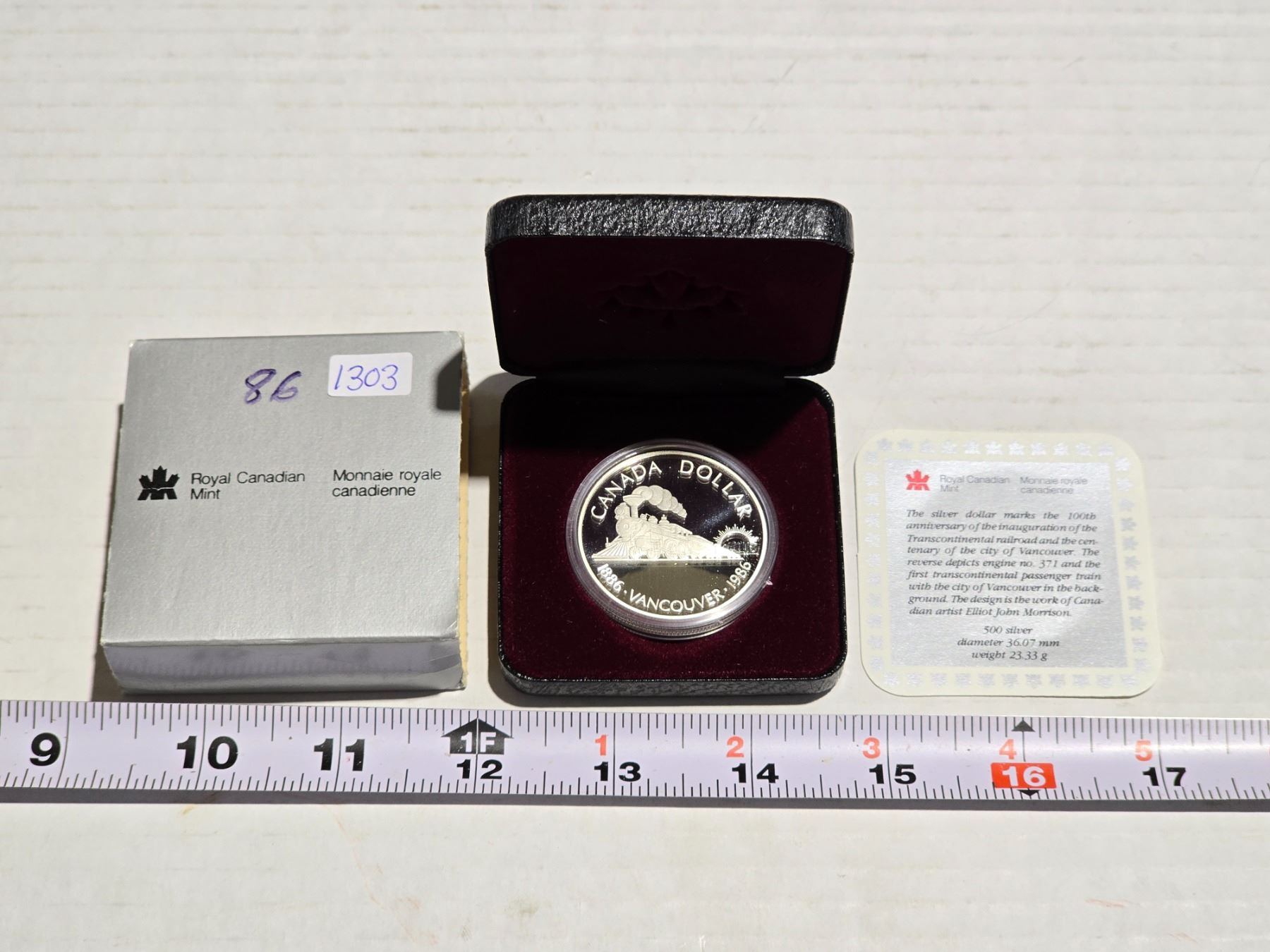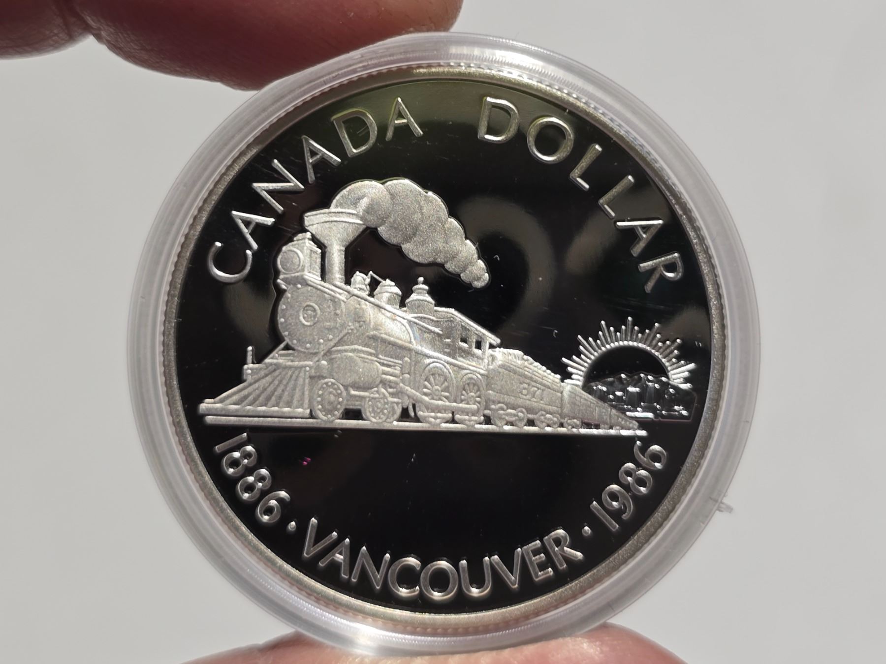 1986 Canadian "Vancouver Railway" silver dollar, in RCM square case
