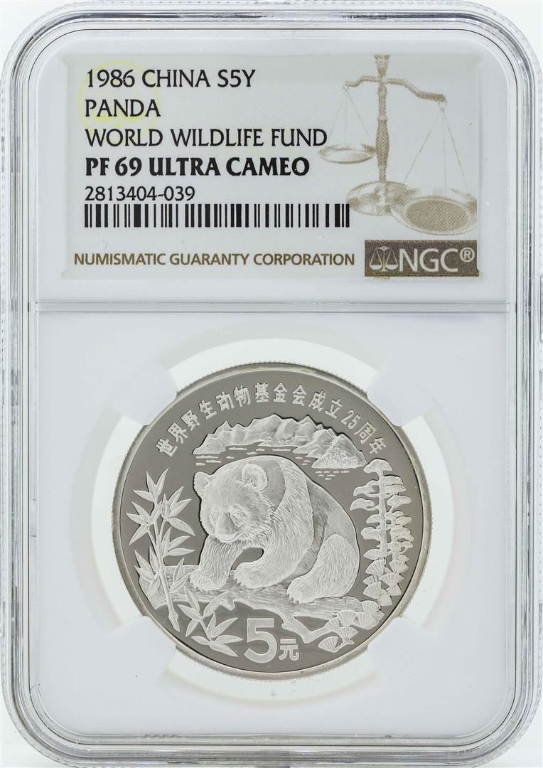 1986 China 5 Yuan Panda Silver Coin World Wildlife Fund NGC PF69 Ultra Cameo