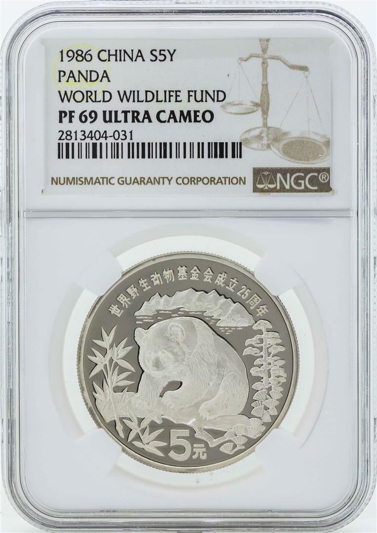 1986 China 5 Yuan Panda Silver Coin World Wildlife Fund NGC PF69 Ultra Cameo