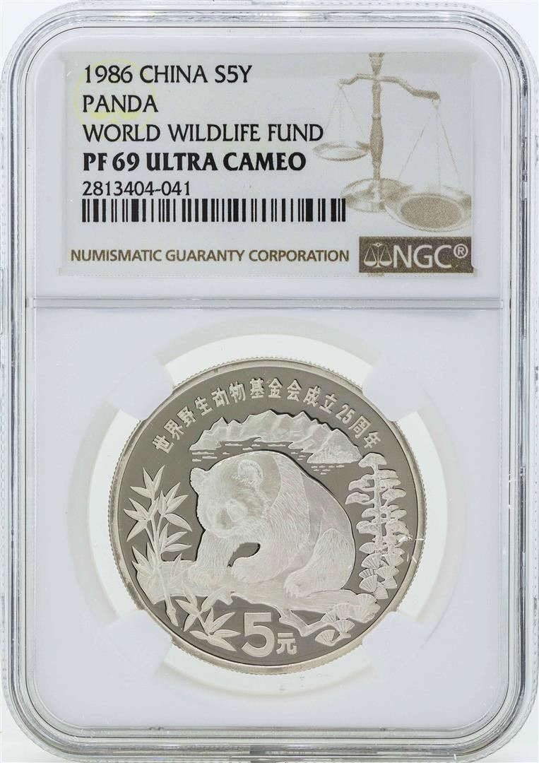 1986 China 5 Yuan Panda Silver Coin World Wildlife Fund NGC PF69 Ultra Cameo