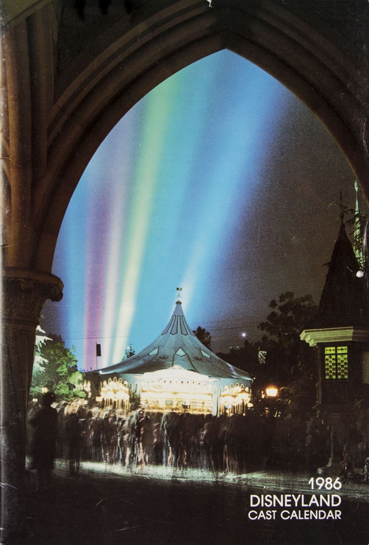 (Disneyland, 1986) The July 4, 1985 issue of the cast member publication Disneyland Line magazine, announced a photo contest for cast members to submit their photos of the park. The winning selections were turned into this 1986 cast member calendar which has notable holidays and significant Disney milestones labeled. This calendar measures 12"x8" and is in very good condition with minor cover-wear.