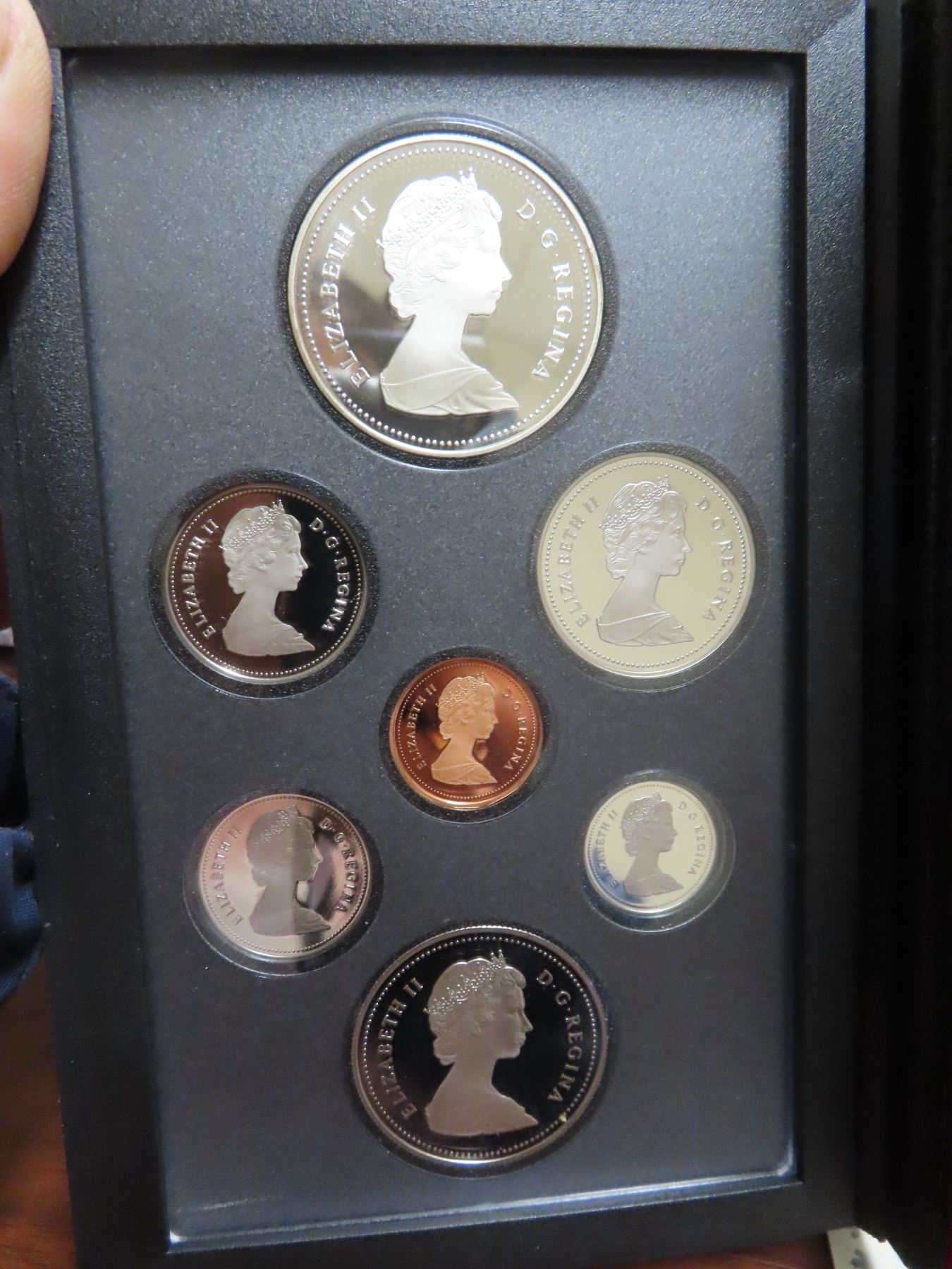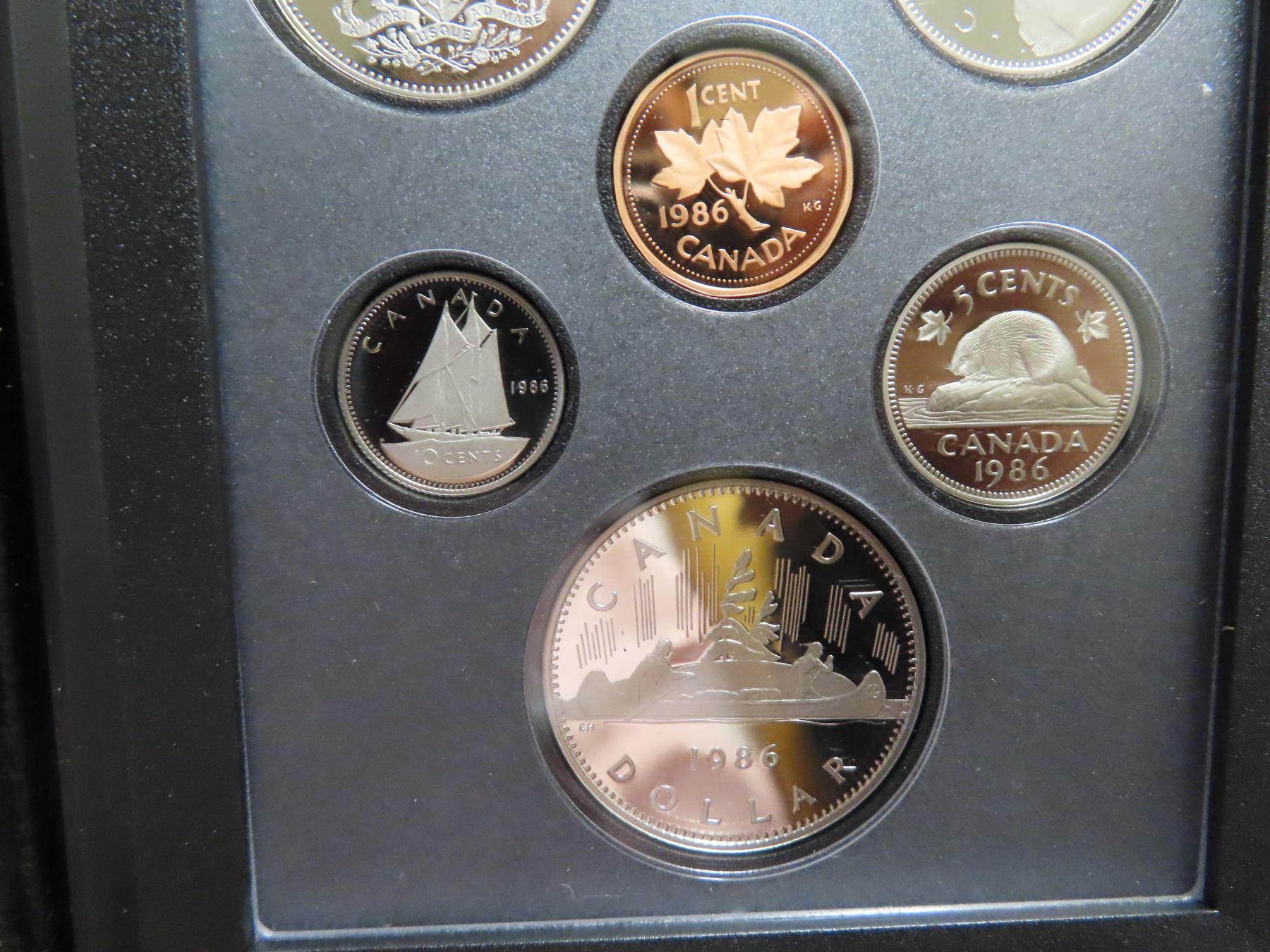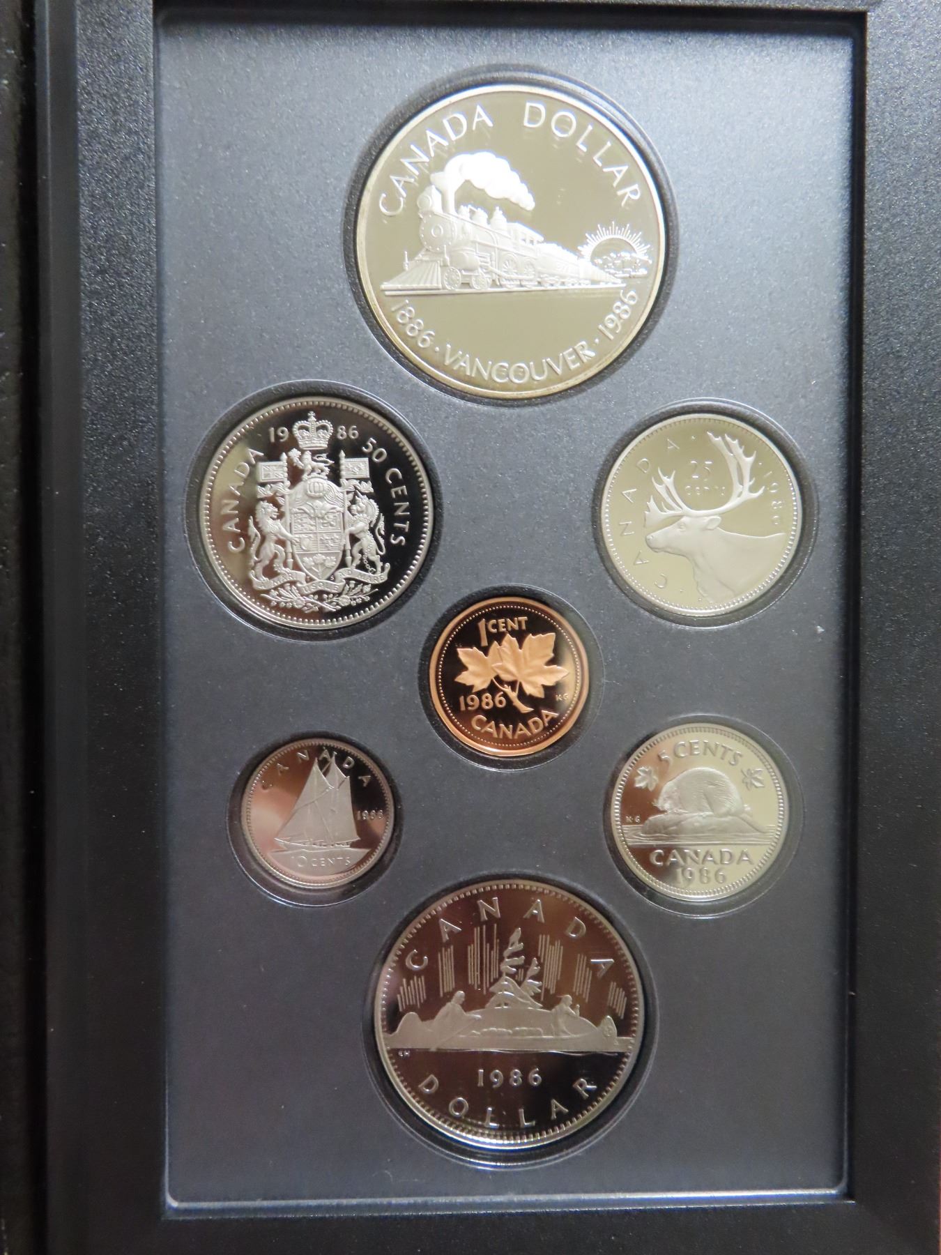 1986 Double Dollar Proof Set. Silver Dollar commemorates the 100th Anniversary of Vancouver. Popular train. Proof with Ultra Heavy Cameos. Housed in its original Royal Canadian Mint case of issue. Includes Certificate of Authenticity.