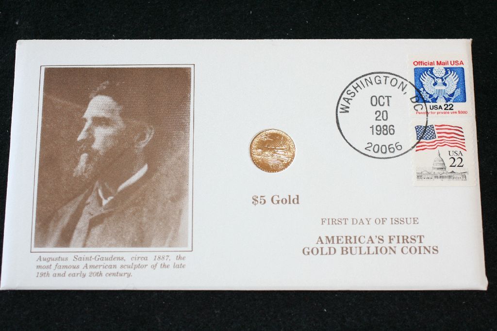1986 First Day Issue St. Gauden's $5 Gold Coin W/Postal Stamps