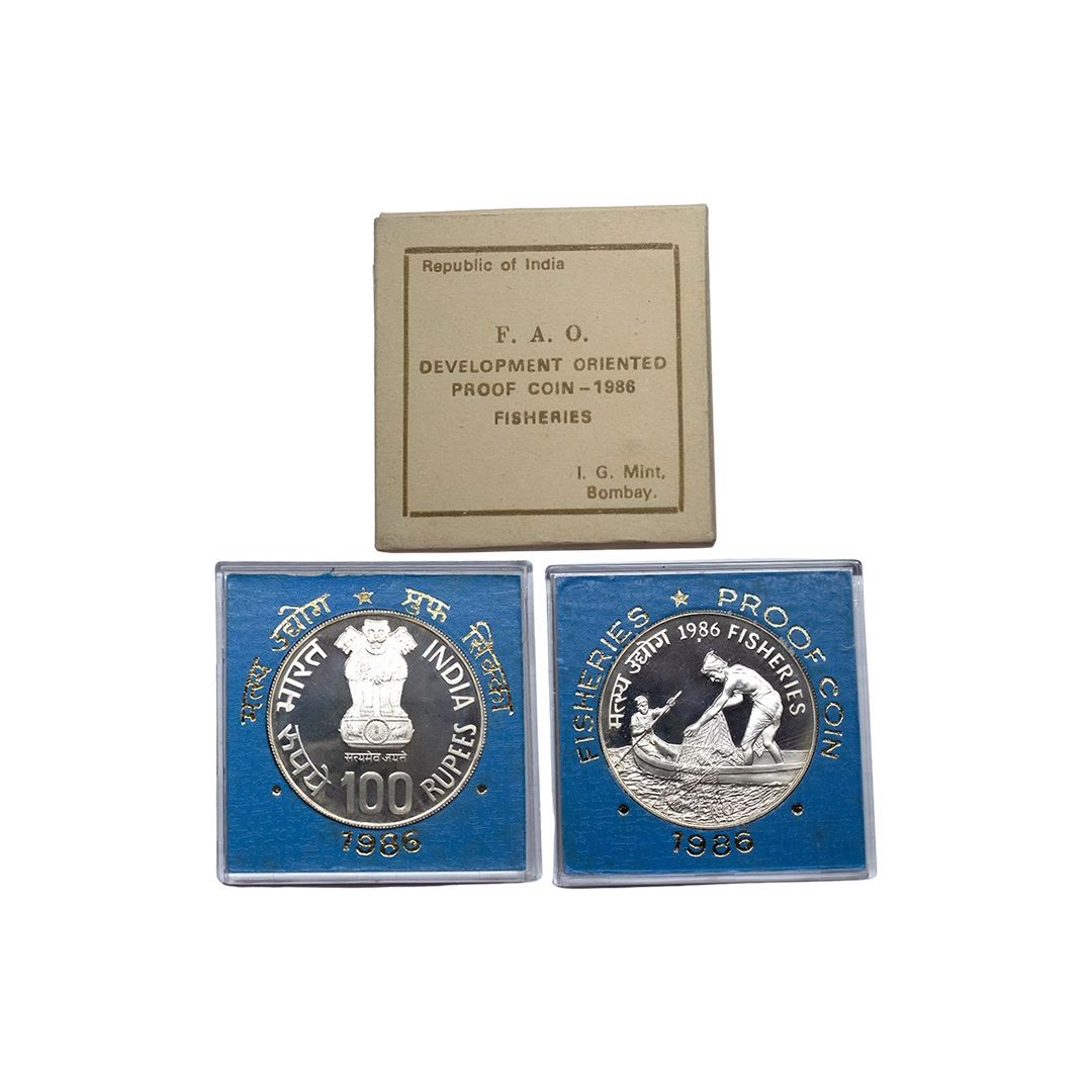 1986, Fisheries, Proof set of 1 Coin, 100 Rupees, Bombay Mint, RB 124, in original mint packing with detail card.