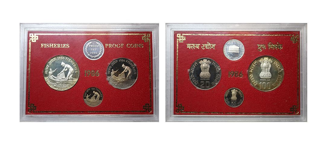 1986, Fisheries, Proof set of 3 coins, 100 Rupees, 20 Rupees and 50 Paise, Bombay mint, RB 122, in original mint packing.