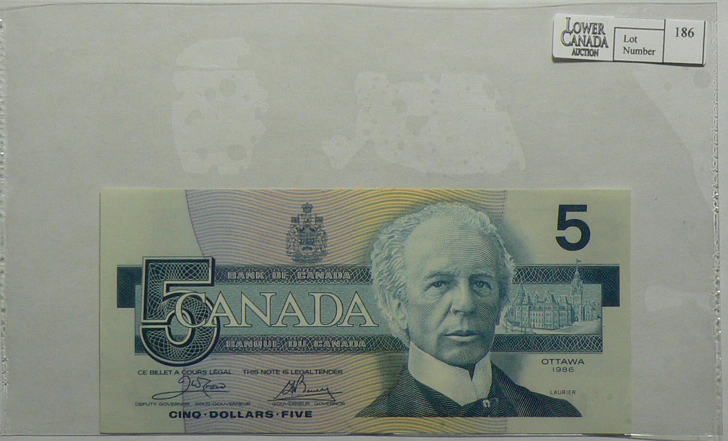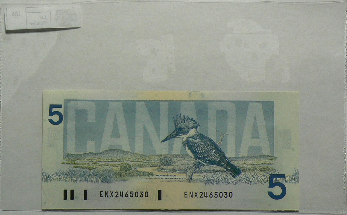 1986 Five Dollars Replacement, BC-56aA-i, Choice UNC, Crow Bouey, serial ENX2465030, Blue B.P.N..