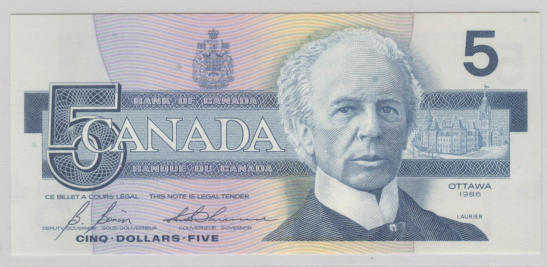 1986 Five Dollars Replacement, BC-56cA, BCS UNC-64, Bonin Thiessen, serial GOT7726434, insert range 7.720M - 7.740M.