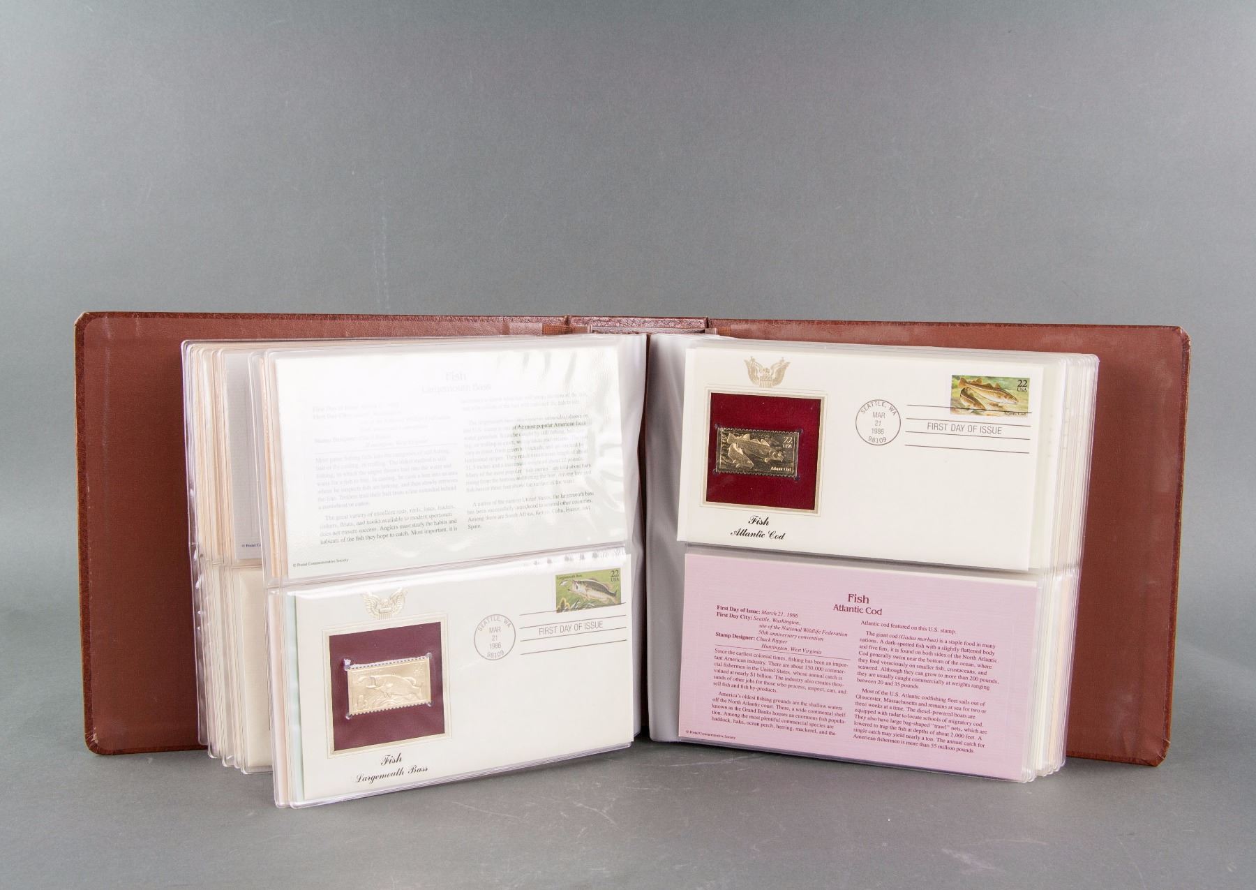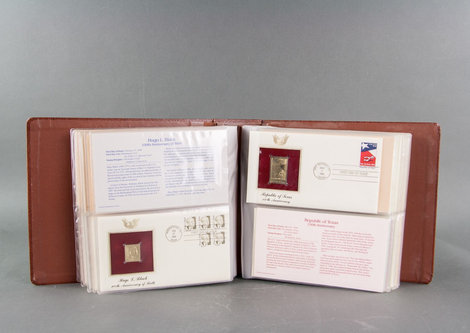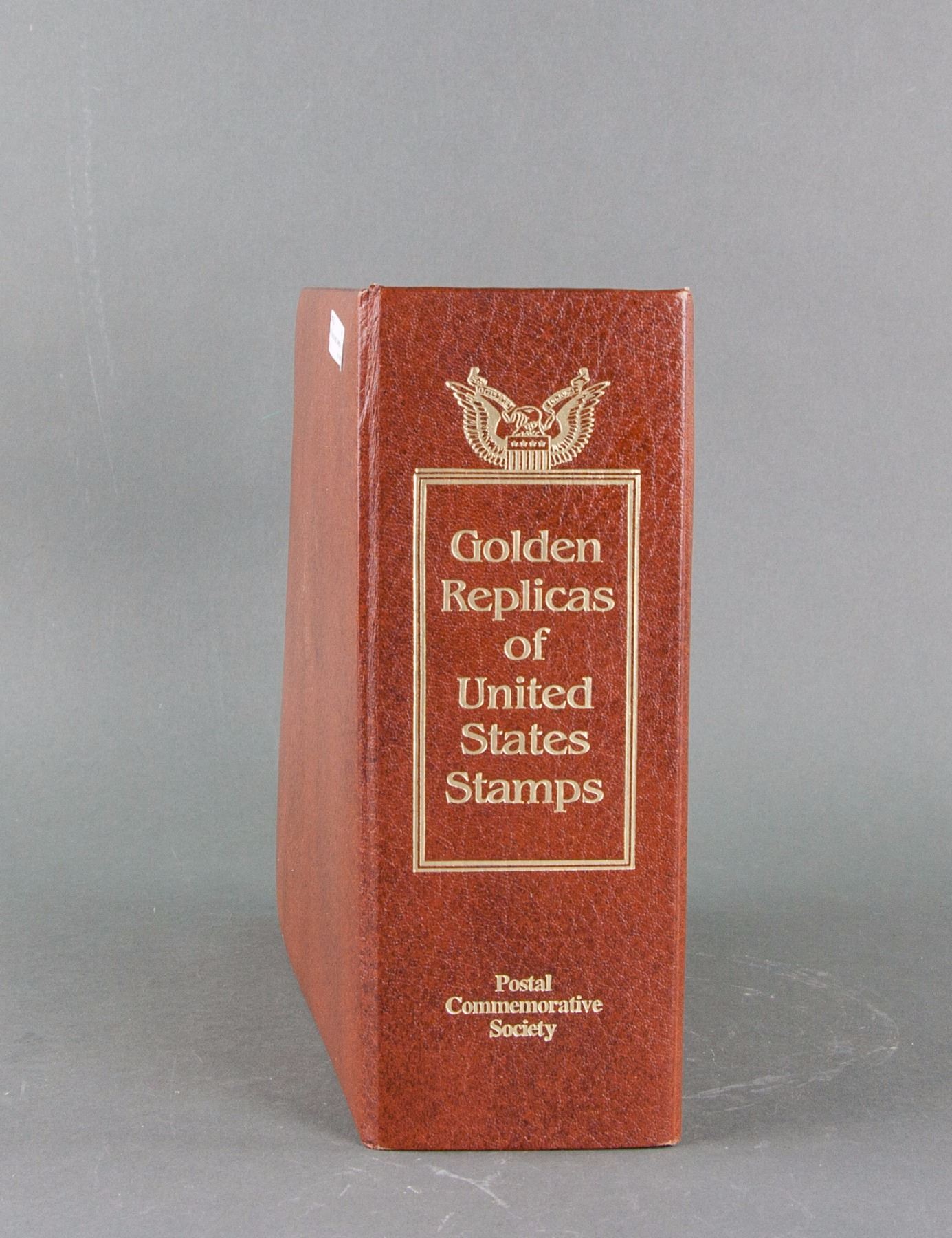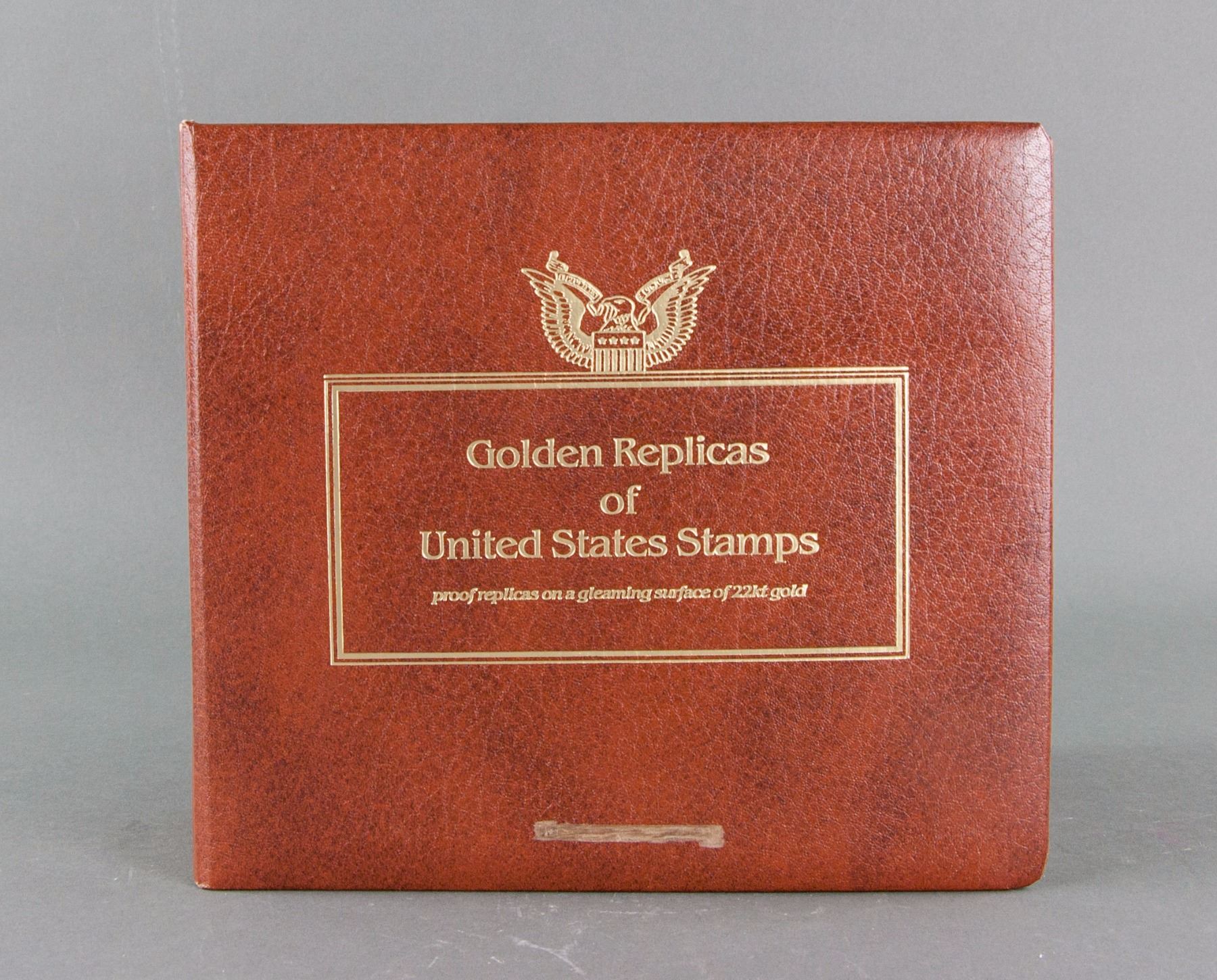 1986 Golden Replicas of US stamps booklet; on gleaming surface of 22kt gold 39 pieces with envelops with stamps; published by Postal Commemorative Society; 24.5 cm x 27.5 cm