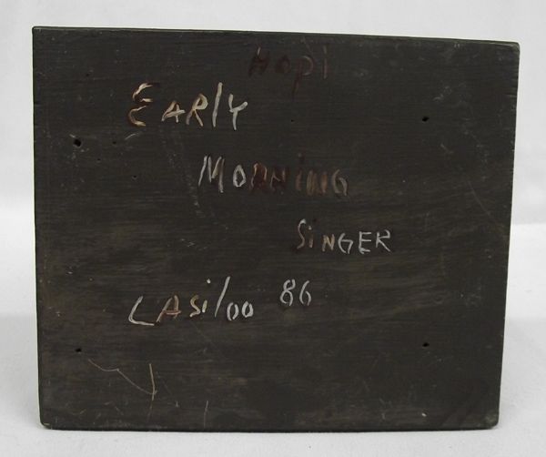 1986 Hopi Early Morning Singer Kachina by Lasiloo, from the Nick and Suzanne Nicholas Collection. Measures approx. 9'' x 16''. Good condition for age. Signed on the bottom by artist.