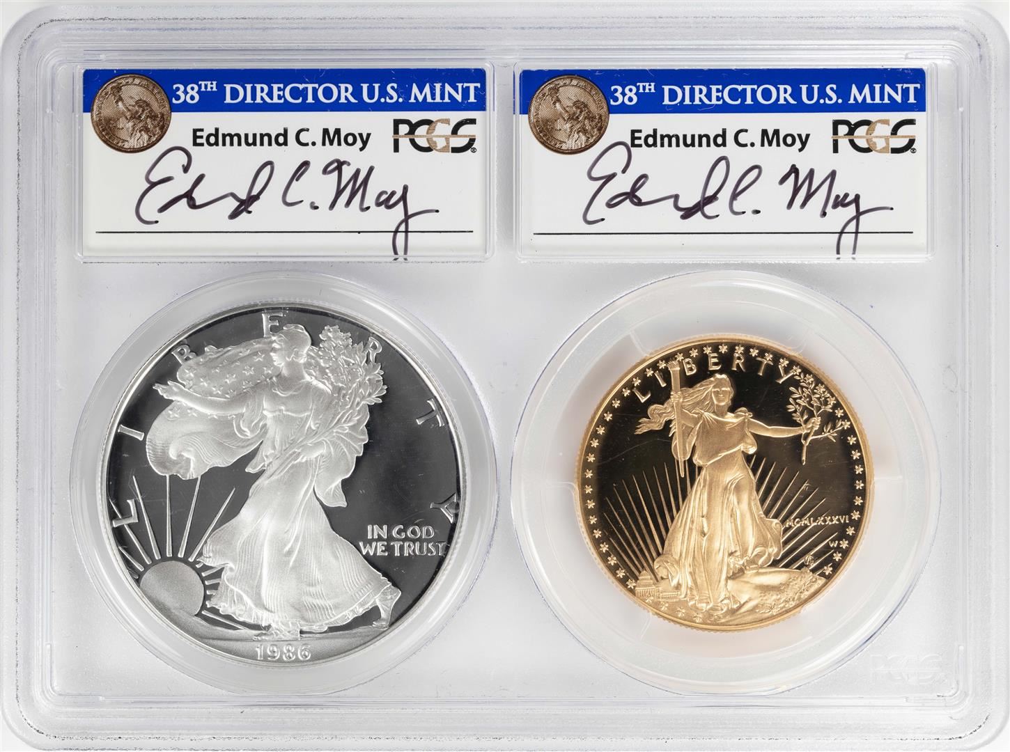 One 1986 Inaugural Issue American Silver and Gold Eagle Coin Set PCGS PR70DCAM Edmund Moy. PCGS Graded.