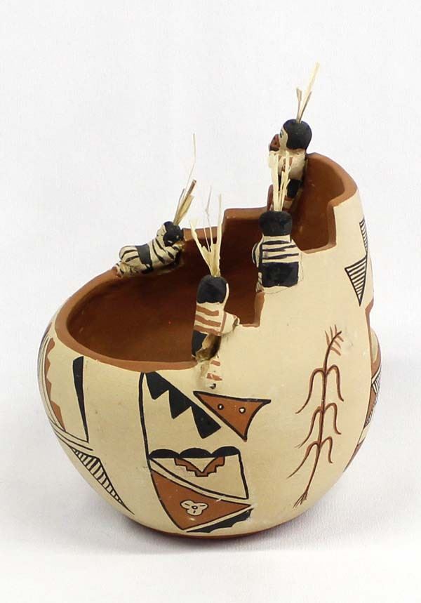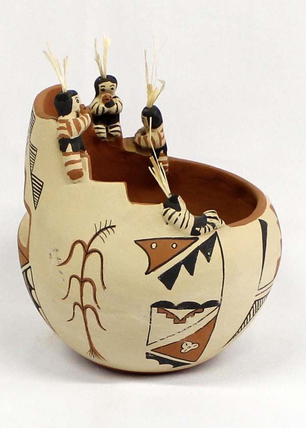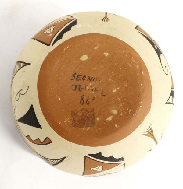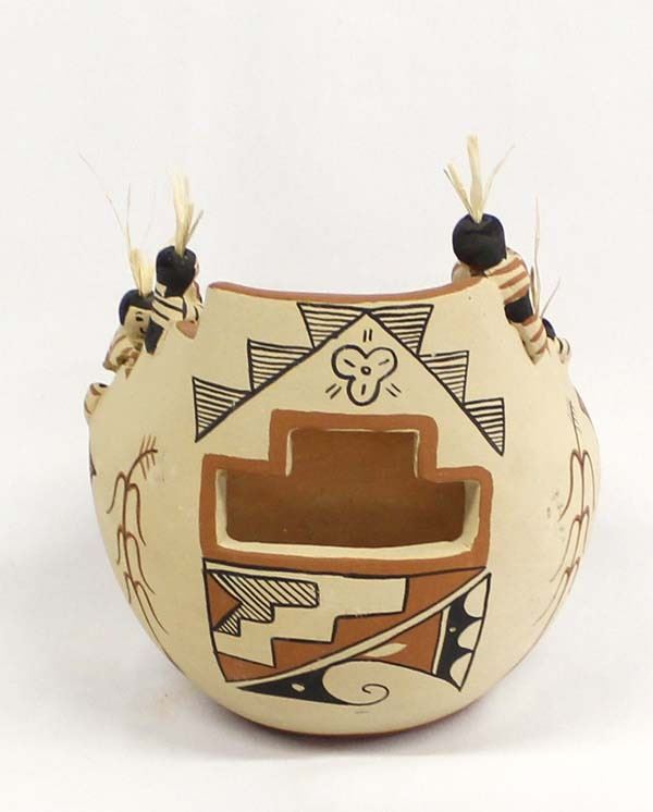 1986 Native American Jemez Pottery Jar by Seonia, measures 7'' x 6'' and is signed on the bottom, one of the figures leg is partially missing, one figure has been glued back on the jar, some paint loss and surface wear
