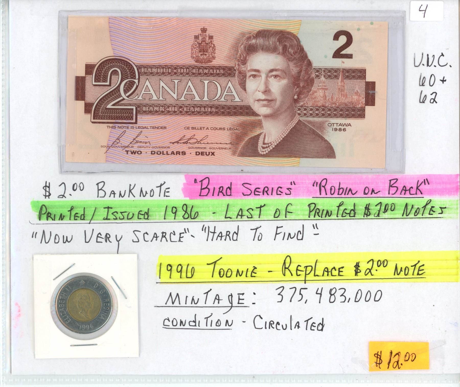 1986 Last of Printed $2 Canada Note UNC, 1996 Toonie $2 Coin