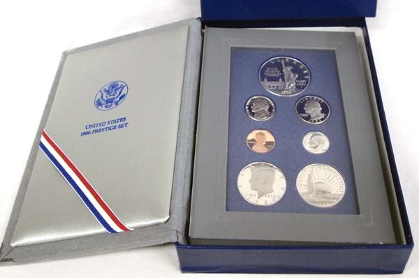 1986 Liberty Prestige Proof Set, includes Lincoln Cent, Jefferson Nickel, Roosevelt Dime, Washington Quarter, Kennedy Half Dollar, Liberty Half Dollar, and Liberty Silver Dollar, comes in beautiful presentation case