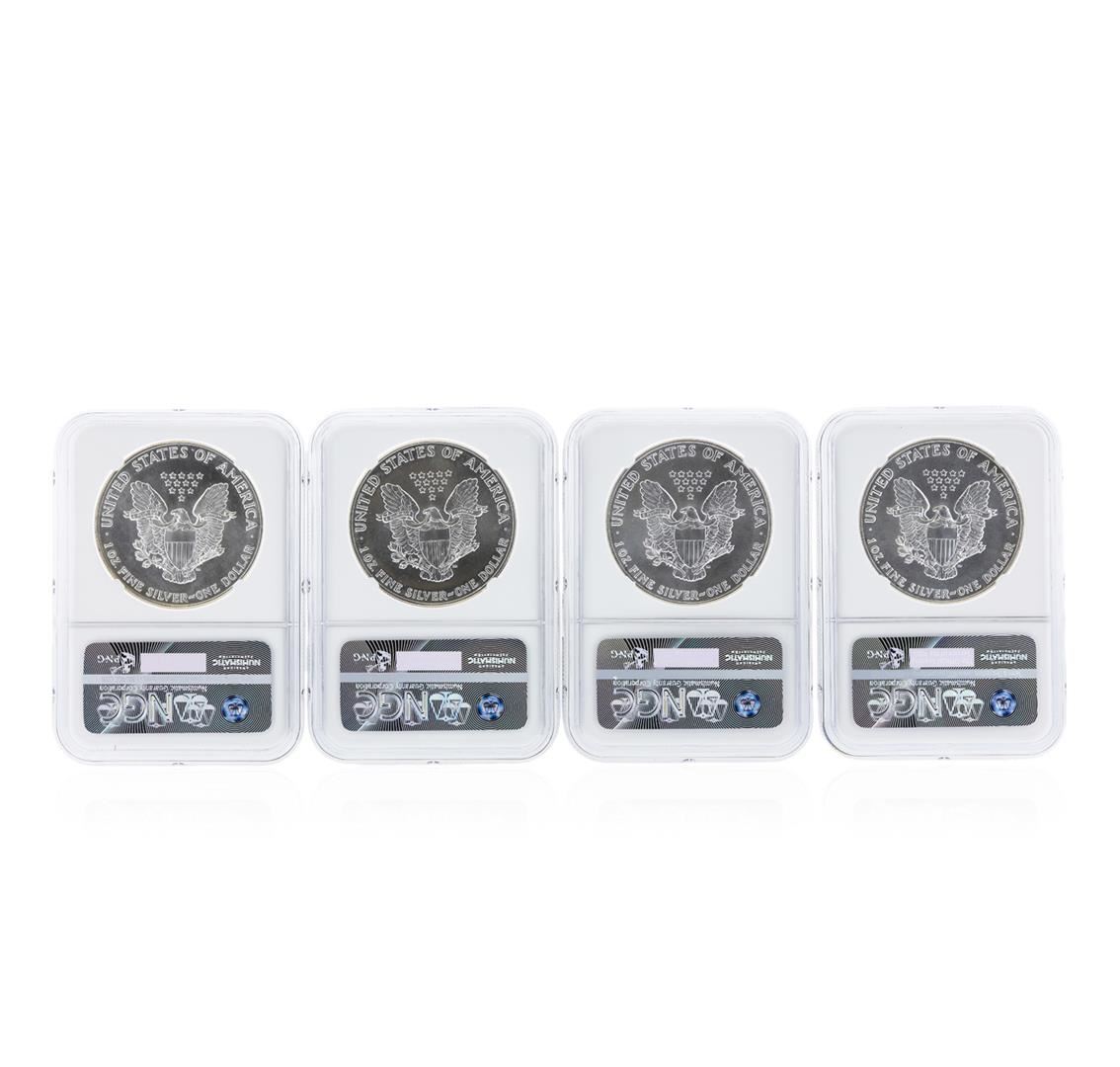 One 1986 NGC MS69 $1 American Silver Eagle Coin Set. The set features four 1986 NGC MS69 $1 American Silver Eagle Coins. NGC Certified.