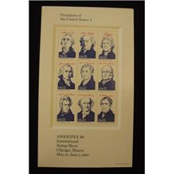 1986 Presidential Commemorative 22 cent postage stamps. Includes USPS folder and 2 of the 4 sheets issued (18 presidents). From the International Stamp Show in Chicago.