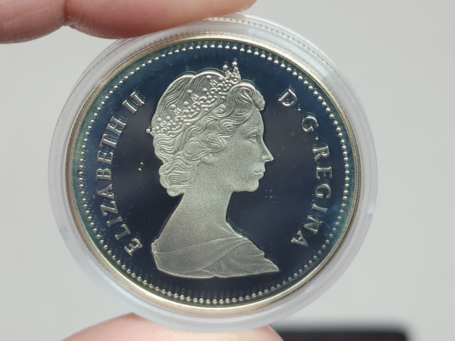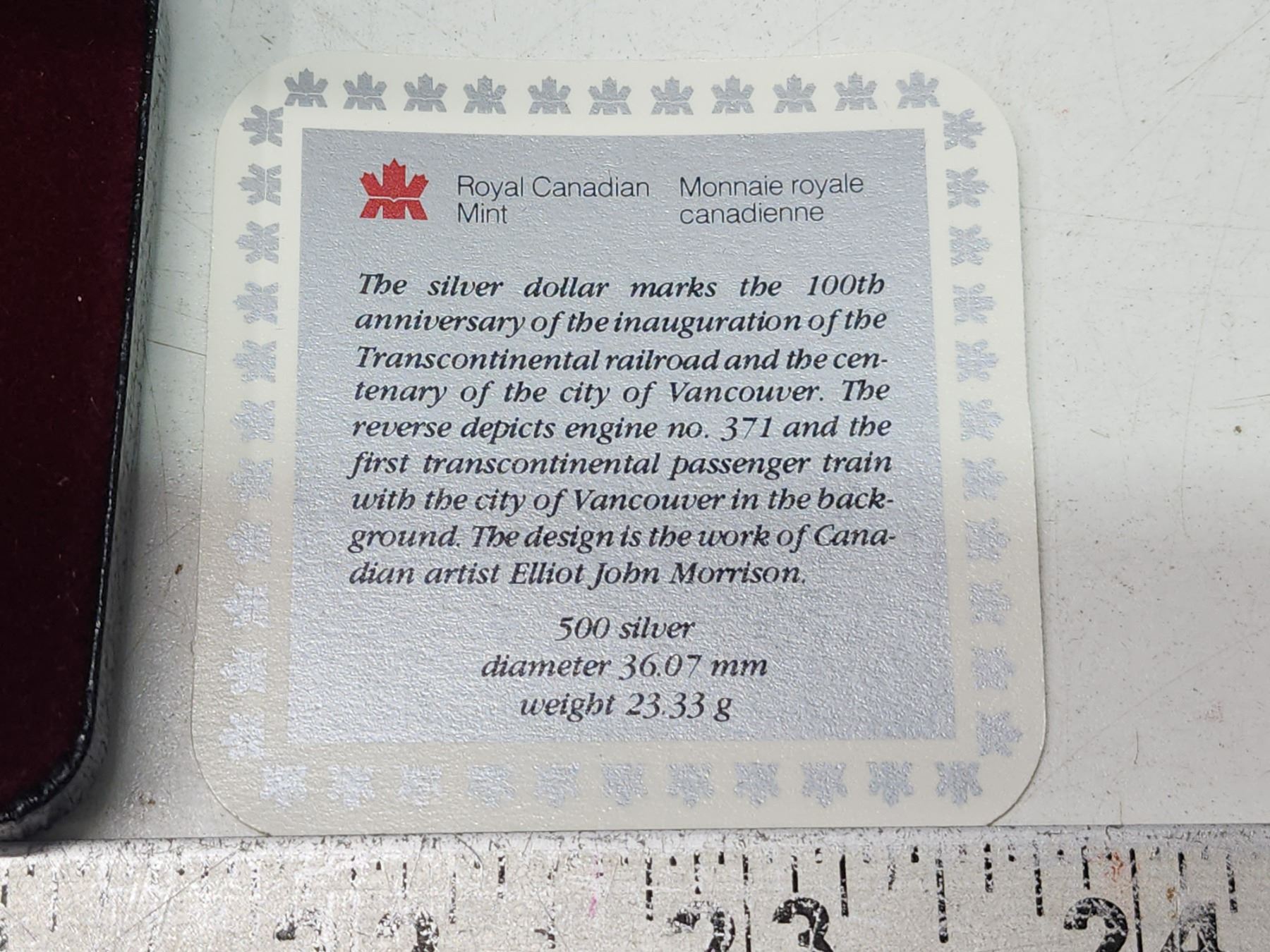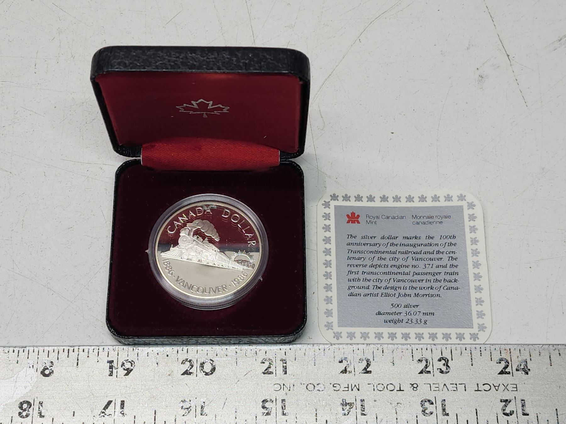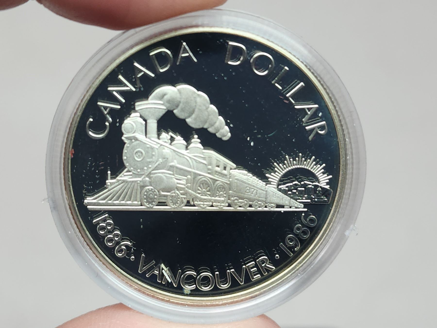 1986 Proof Silver Dollar. Commemorates the 100th Anniversary of Vancouver. Popular train. Proof with Ultra Heavy Cameo. Bright White. Housed in its original Royal Canadian Mint case of issue. Includes Certificate of Authenticity.