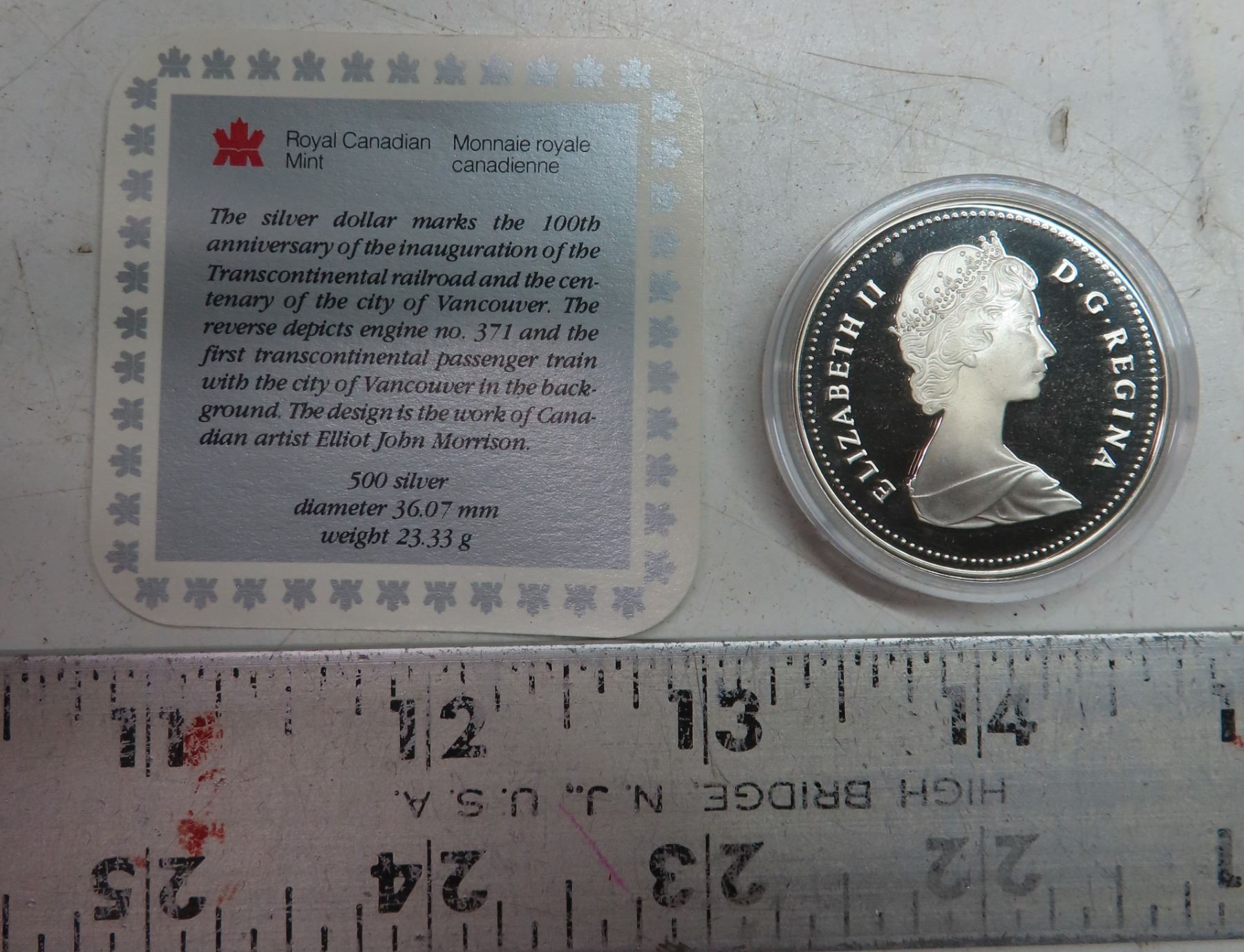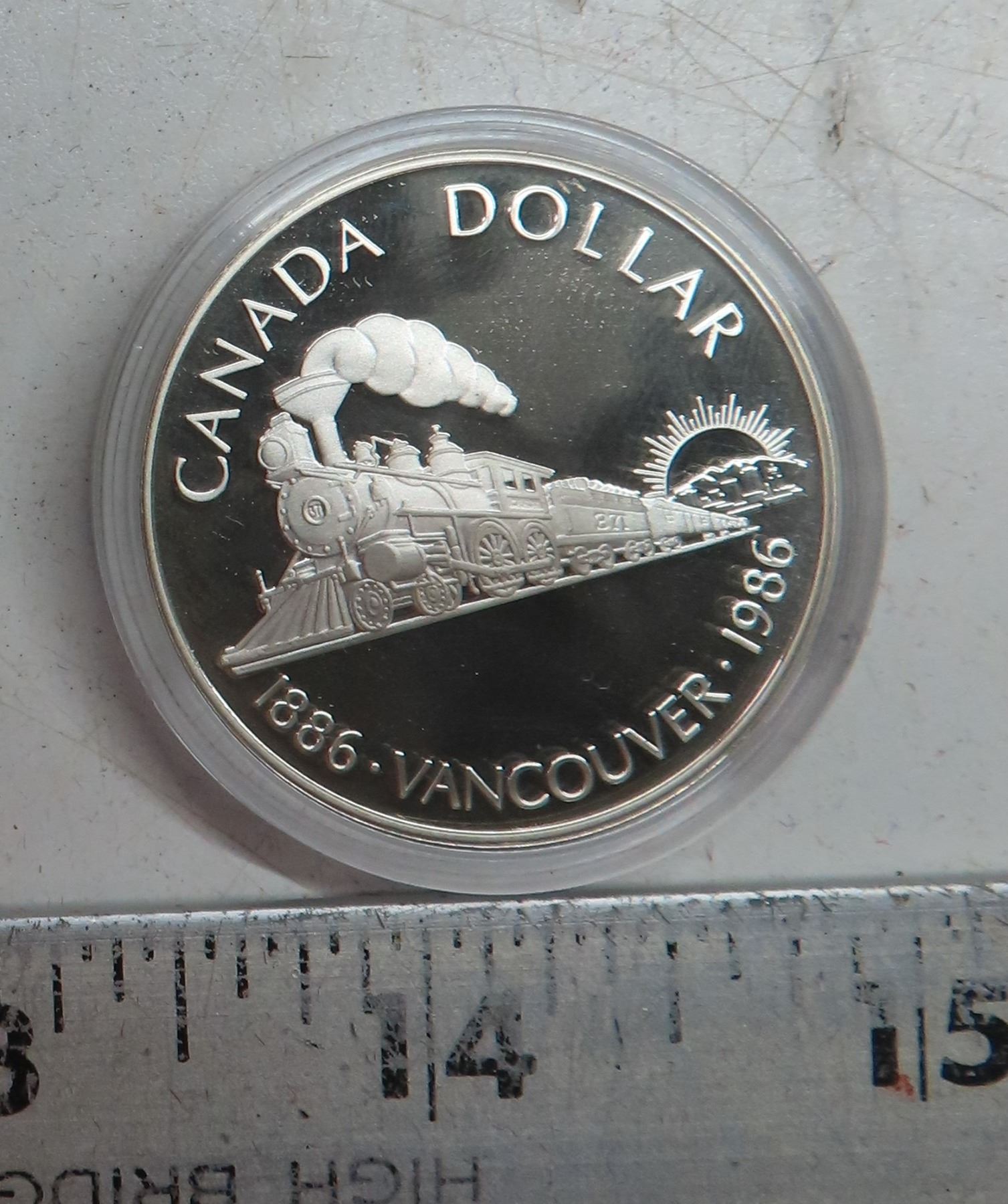 1986 Proof Silver Dollar. Commemorates the Centennial of Vancouver. Popular Train. Proof with Ultra Heavy Cameo. Includes Certificate of Authenticity. Housed in its original Royal Canadian Mint case of issue.