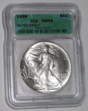 1986 RARE 1ST YEAR CERTIFIED 1oz SILVER EAGLE *CERTIFIED BY ICG MS-69*!! SILVER EAGLE CAME OUT OF SAFE!! ***Coin, Currency & All Items Listed in this auction - Grades, Conditions and Values are not Safe Deposit Coins LLC Responsibilty. Grades, Condition and Values are determined by Consigner(s) & Buyers ONLY