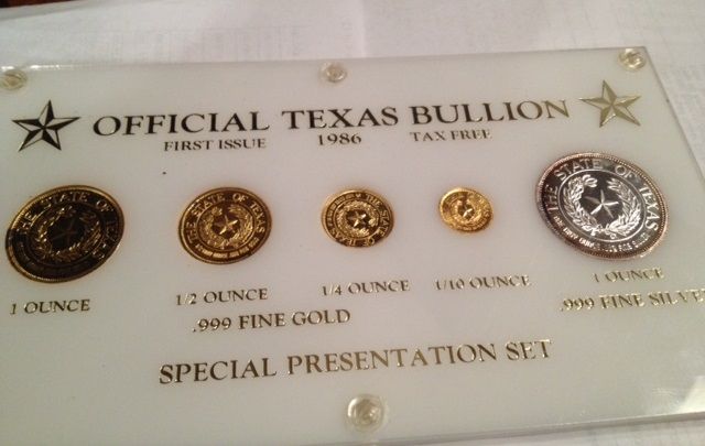 1986 OFFICIAL TEXAS BULLION SET, 1.85 OZ GOLD, 1 OZ SILVER. GOLD PIECES OF 1 OZ, 1/2 OZ, 1/4 OZ AND 1/10 OZ. 1 OZ PURE SILVER ROUND