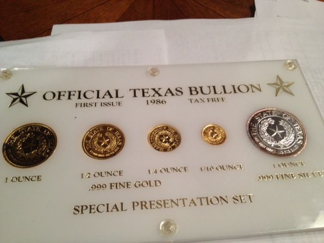 1986 OFFICIAL TEXAS BULLION SET, 1.85 OZ GOLD, 1 OZ SILVER. GOLD PIECES OF 1 OZ, 1/2 OZ, 1/4 OZ AND 1/10 OZ. 1 OZ PURE SILVER ROUND. Very rare. Not many were made and those that are get huge premiums