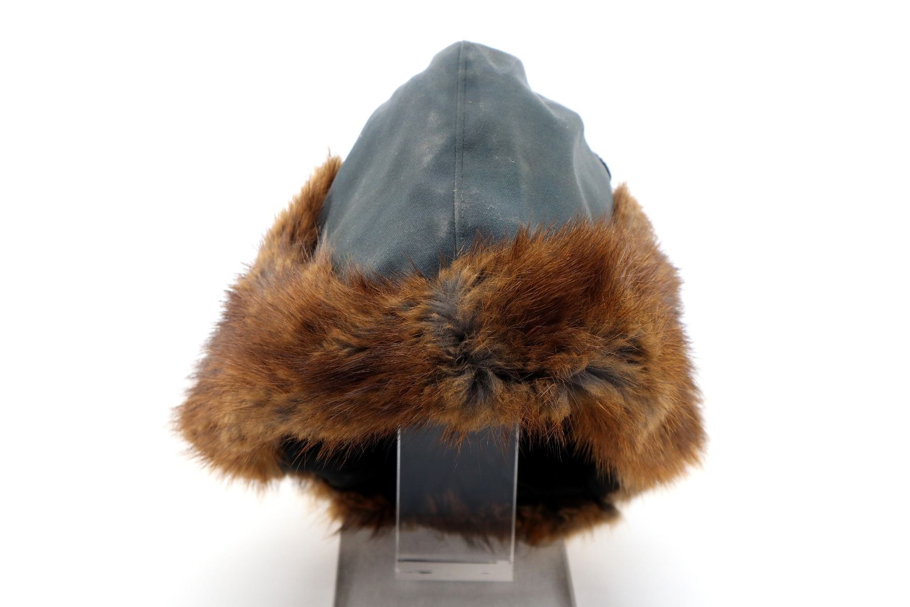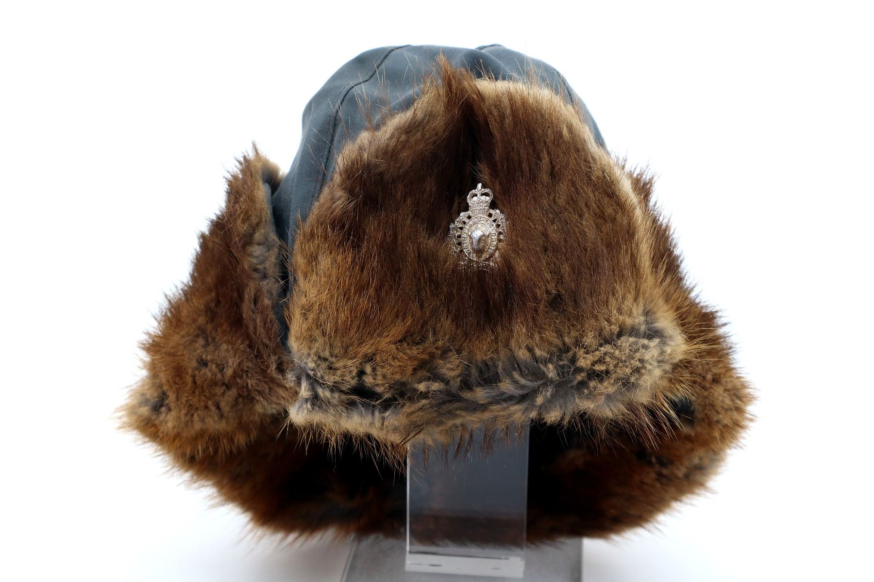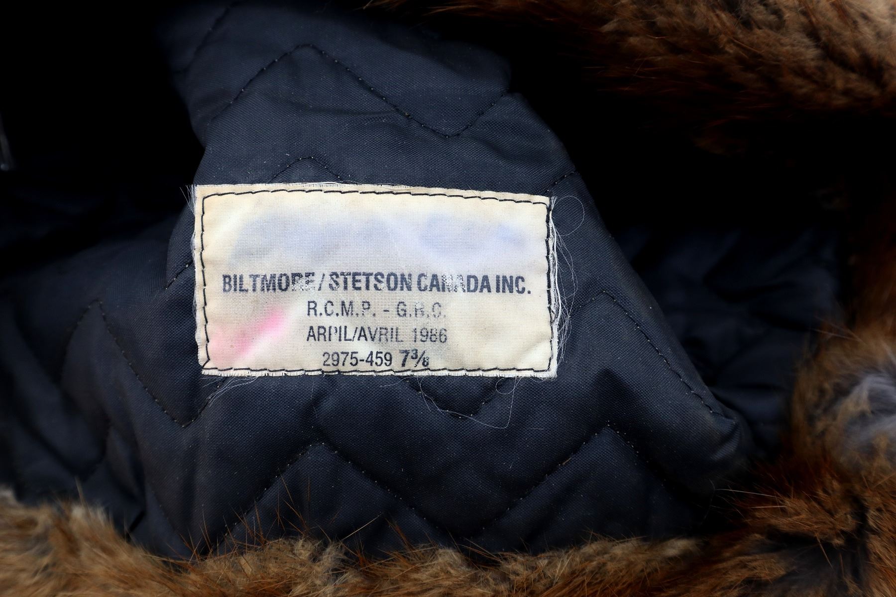 (1) NYLON / CANVAS WINTER HAT WITH MUSKRAT LINED EAR FLAPS / BRIM, RCMP CAP BADGE, INSIDE LABEL MARKED: "BILTMORE/STETSON CANADA INC., R.C.M.P. - G.R.C., APRIL/AVRIL 1986, 2975-459 7 3/8", VELCRO CHIN STRAP, SHOWS AGE / WEAR. SEE PHOTOS.