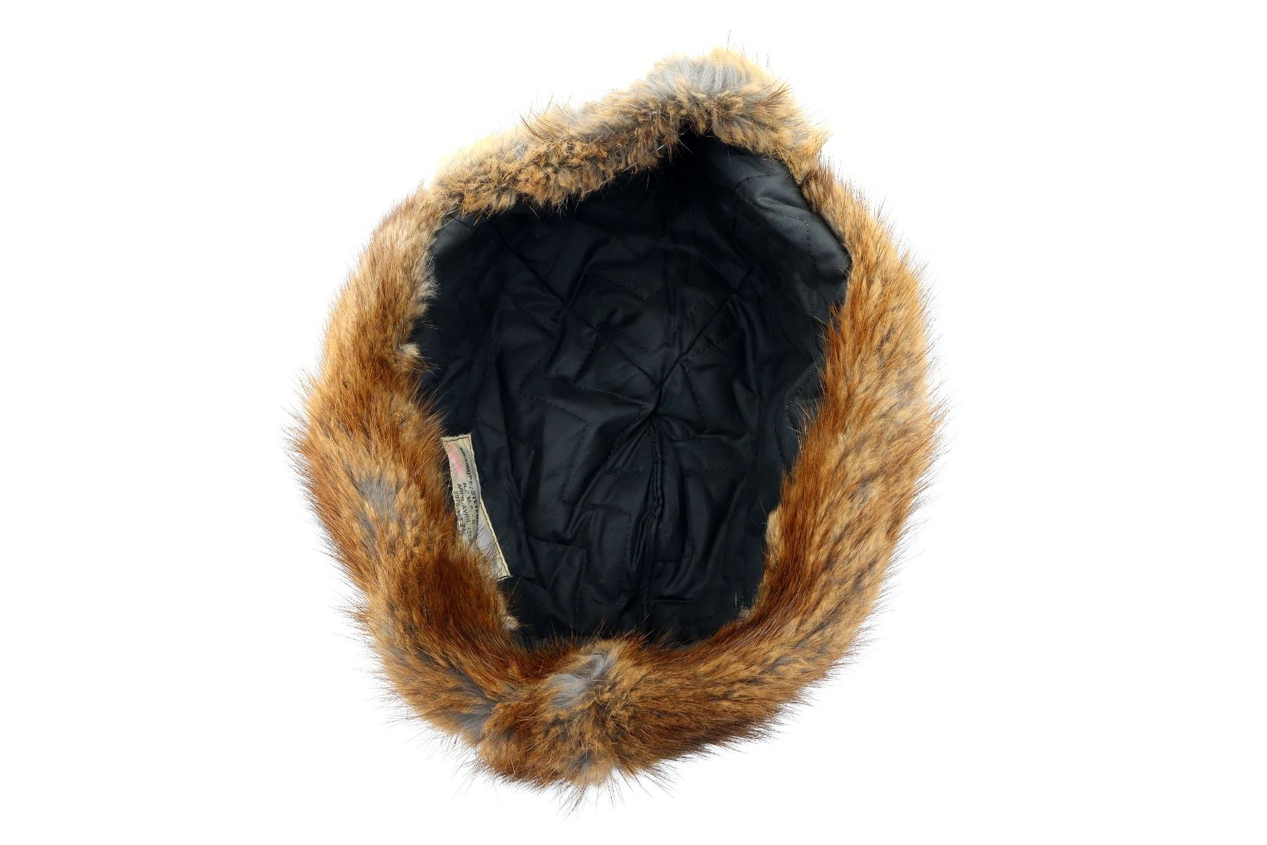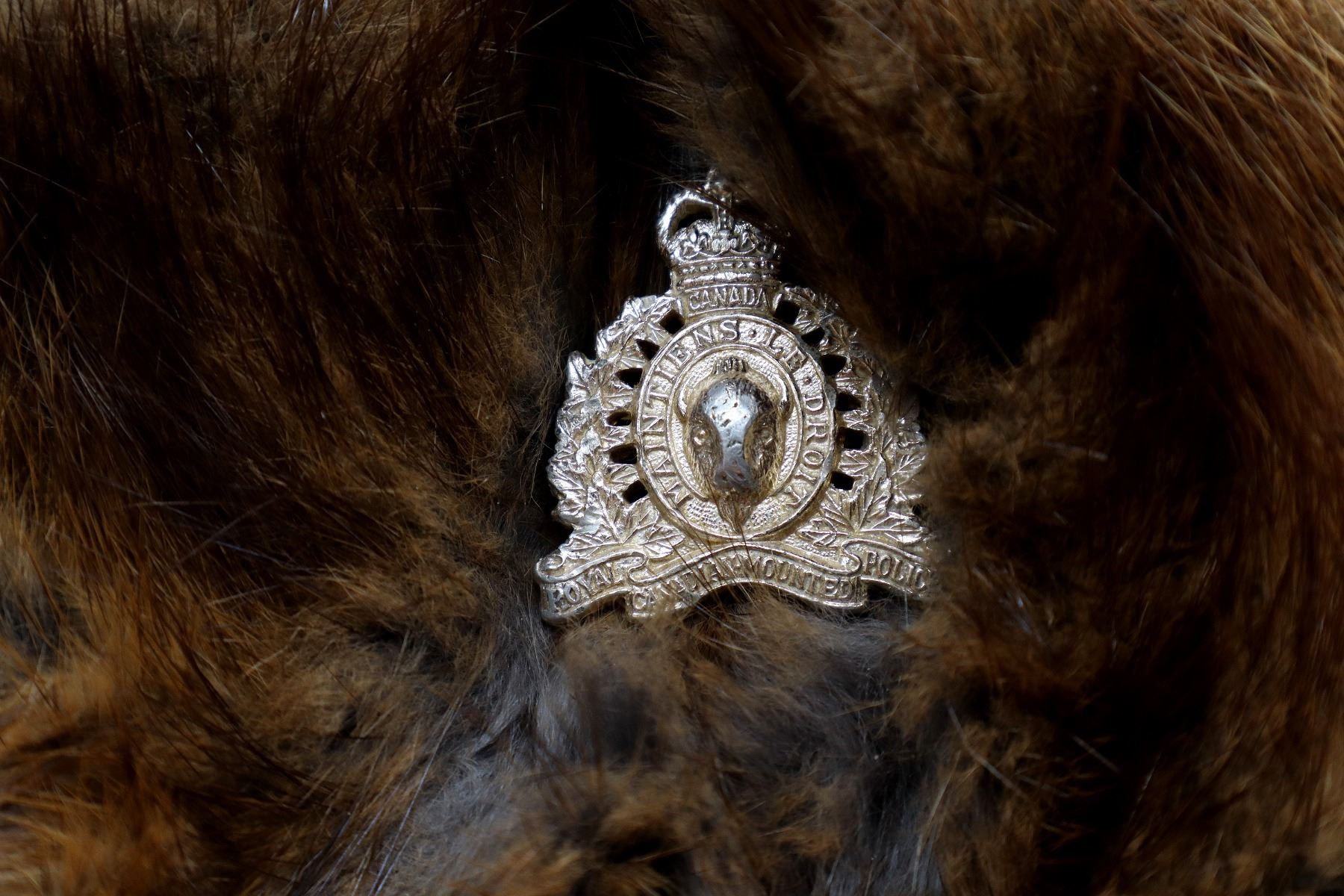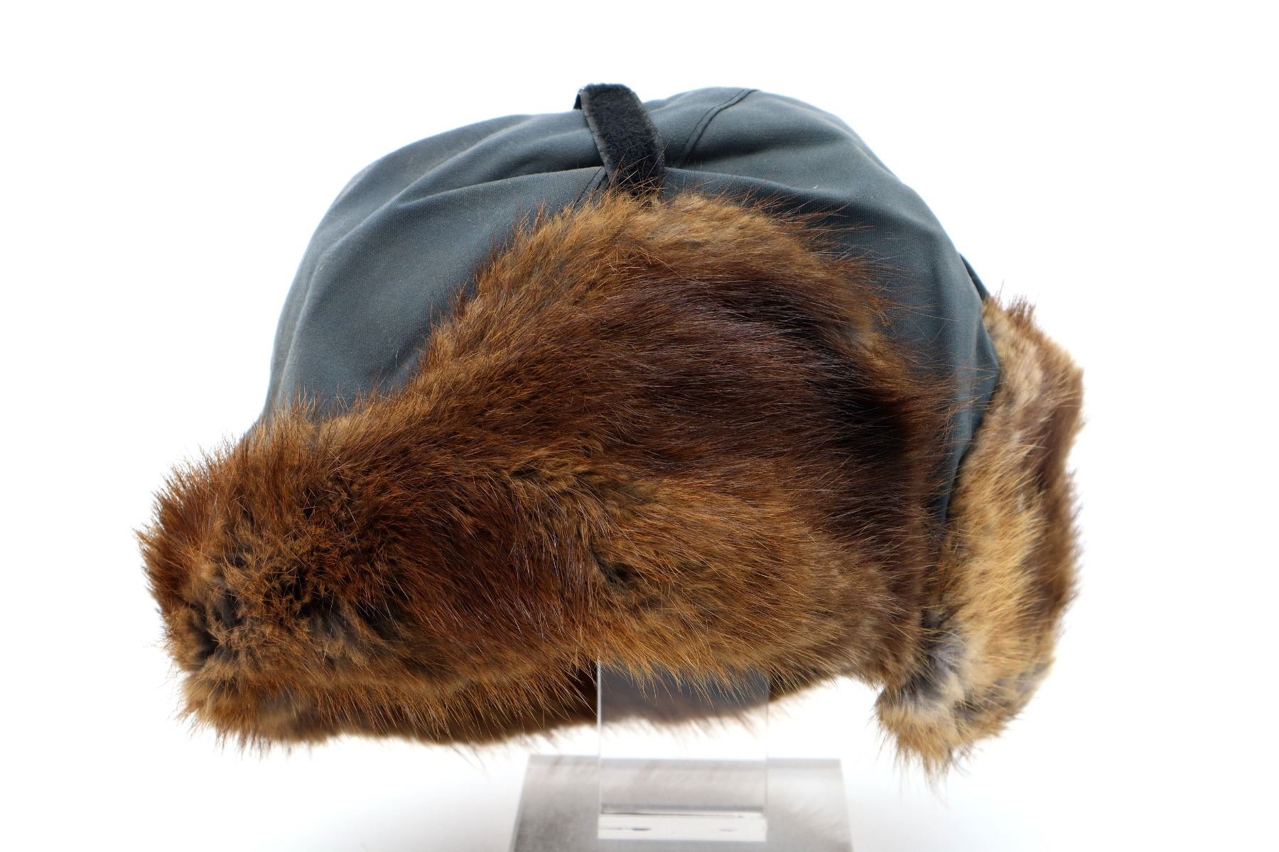 (1) NYLON / CANVAS WINTER HAT WITH MUSKRAT LINED EAR FLAPS / BRIM, RCMP CAP BADGE, INSIDE LABEL MARKED: "BILTMORE/STETSON CANADA INC., R.C.M.P. - G.R.C., APRIL/AVRIL 1986, 2975-459 7 3/8", VELCRO CHIN STRAP, SHOWS AGE / WEAR. SEE PHOTOS.