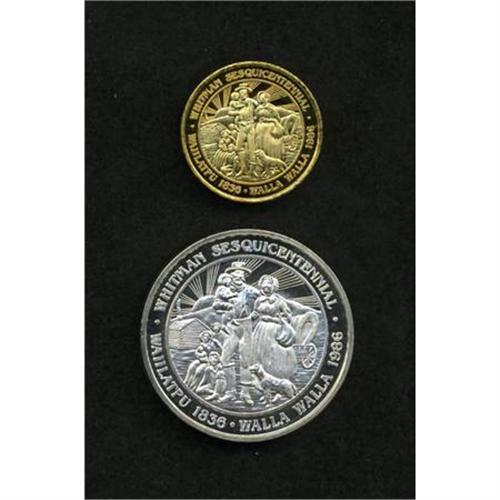 <B>1986 Rare Matched Set, Washington State Gold & Silver Medals.</B></I> 1986 prooflike gold and silver set issued to commemorate the 150th anniversary of Whitman County, Washington. The gold medal is .900 fine, 15.7 gm, 25.5 mm. The silver piece is .999 fine, 31.2 gm, 39.5 mm. Both medals are serial number 16, stamped into the surface.<BR><BR><b>Shipping:</b> Coins & Currency (<a target="_blank" href="http://www.heritageauctions.com/common/shipping.php">view shipping information</a>)