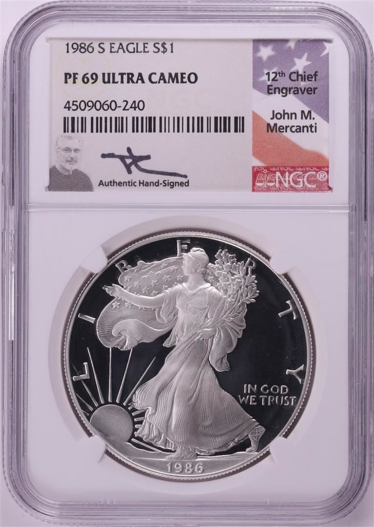 1986-S $1 Proof American Silver Eagle Coin NGC PF69 Ultra Cameo Mercanti Signature
