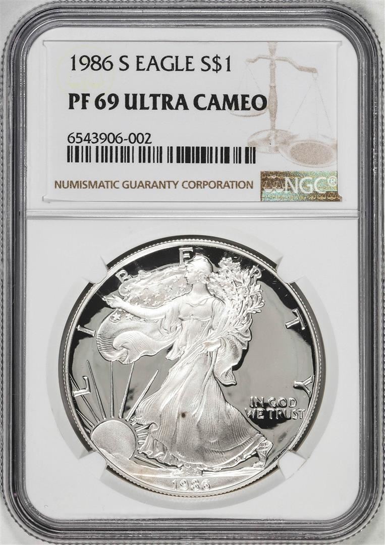 One 1986-S $1 Proof American Silver Eagle Coin NGC PF69 Ultra Cameo. NGC Certified.