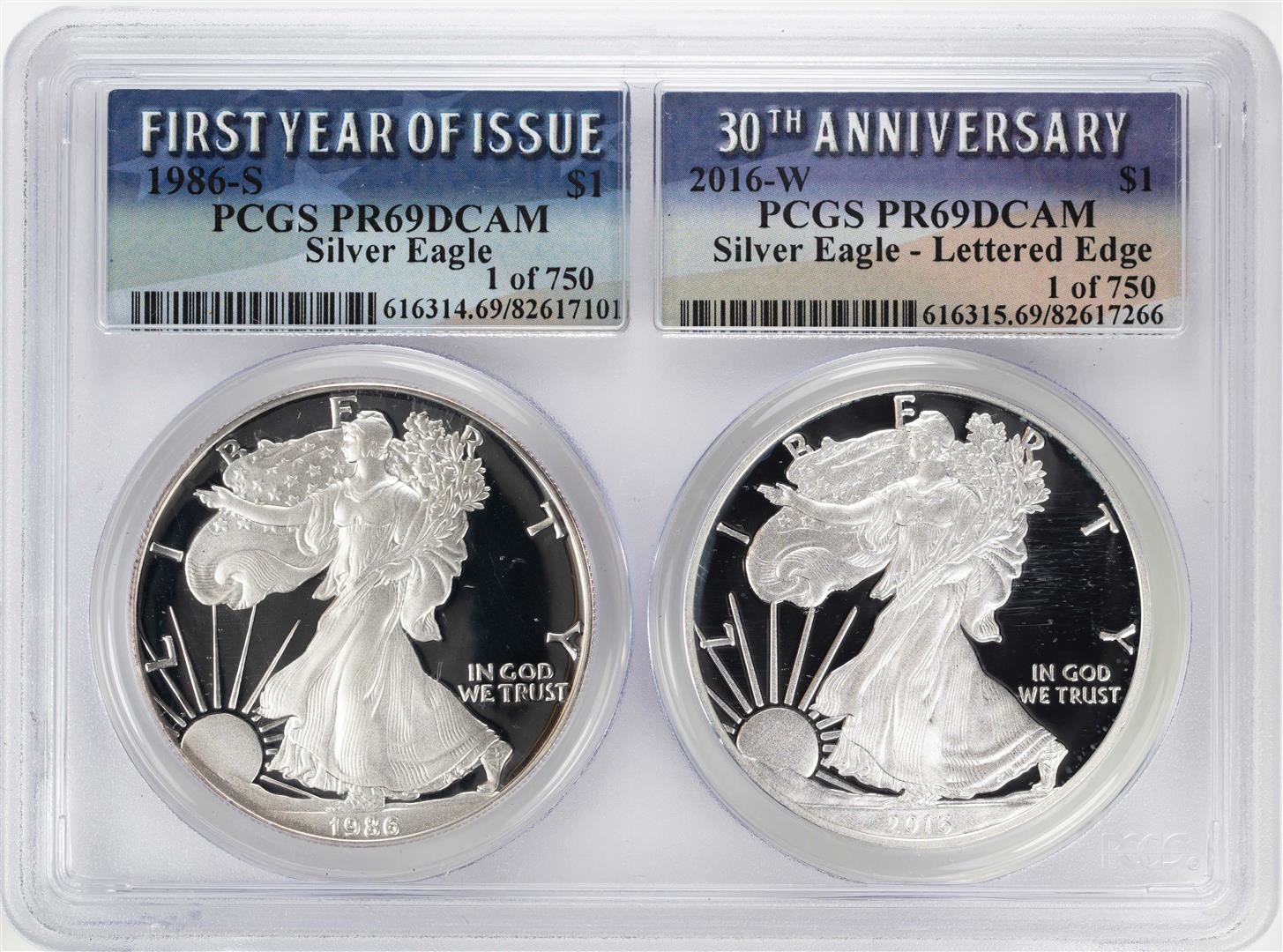 1986-S & 2016-W $1 Proof American Silver Eagle Coin Set PCGS PR69DCAM
