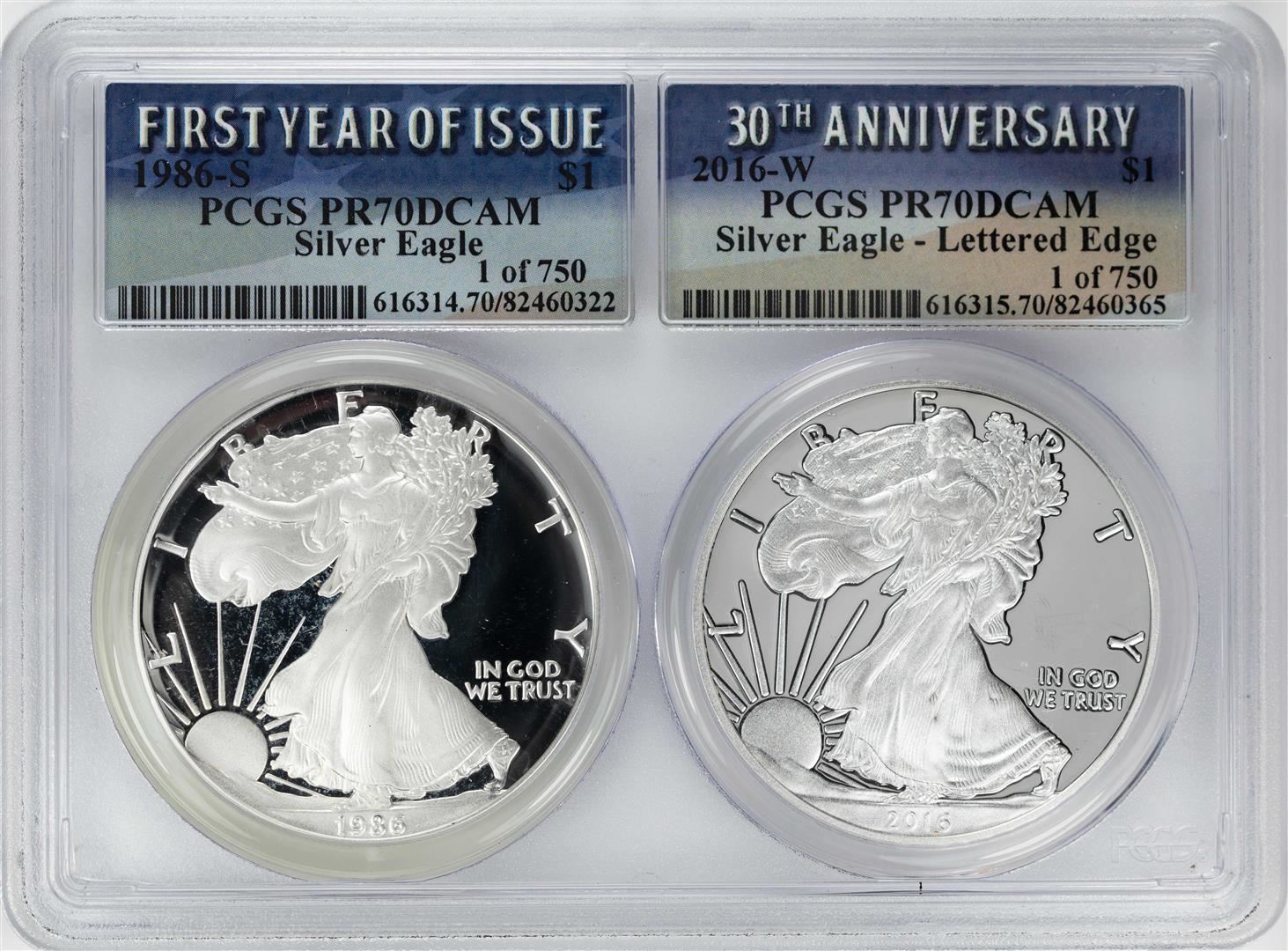1986-S & 2016-W $1 Proof American Silver Eagle Coin Set PCGS PR70DCAM